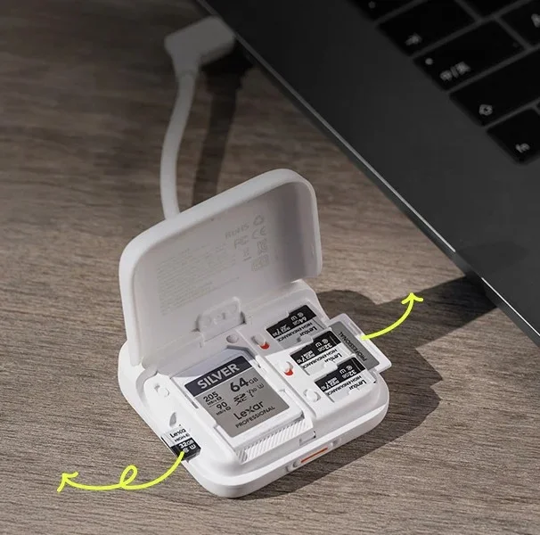 SDカード2枚とmicroSDカード4枚を収納して持ち運びでき、デュアルカード転送も可能