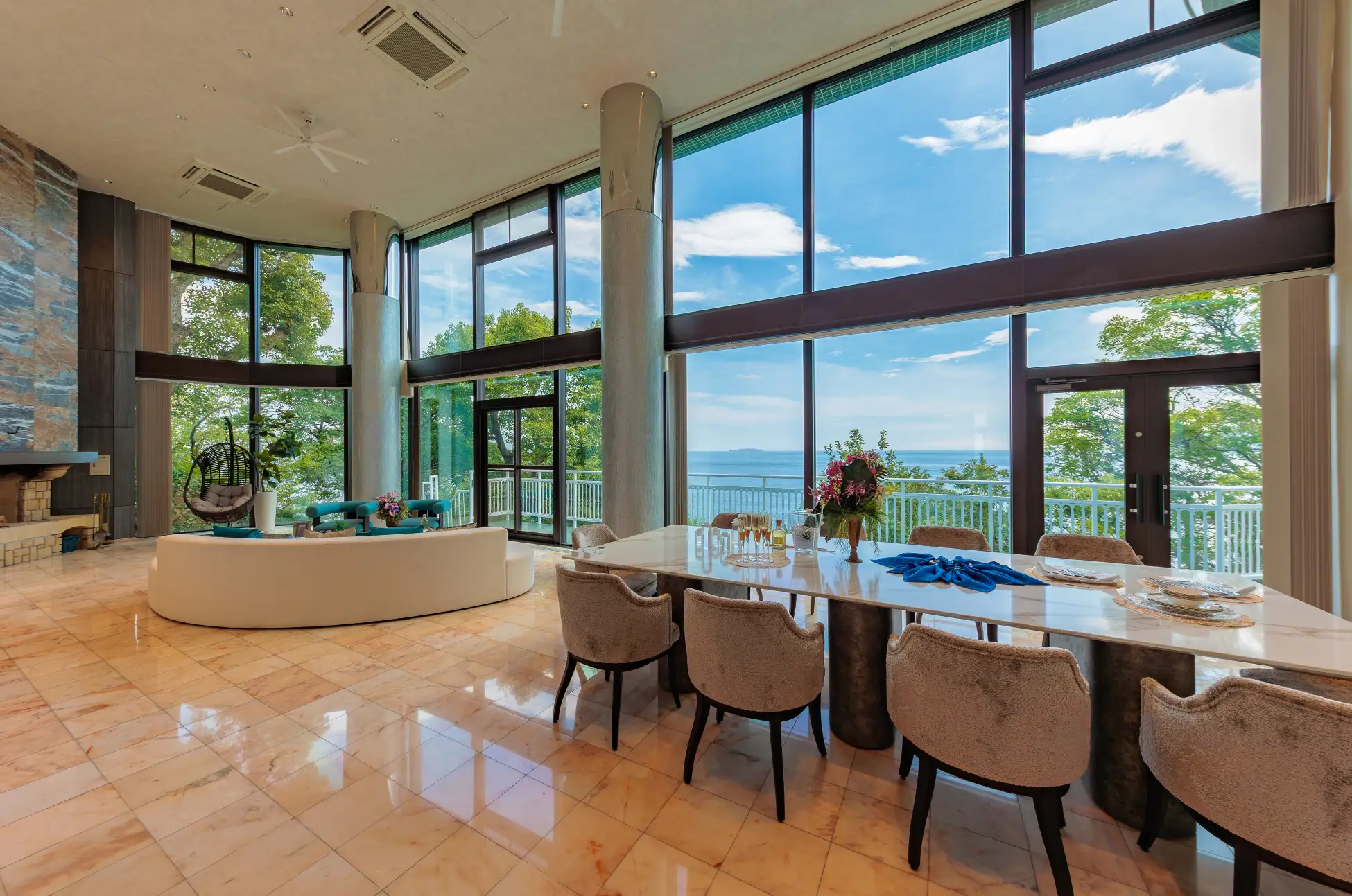 吹き抜けのある明るいリビングダイニングは90㎡を確保し、圧倒的な開放感を演出。また、シャワー室と洗面所、トイレを併設したゲストルームを2つ設け、どなたでもくつろげる空間を用意しました。リビングダイニングとゲストルームはオーシャンビューを享受でき、五感を満たす至福のひとときを満喫いただけます。