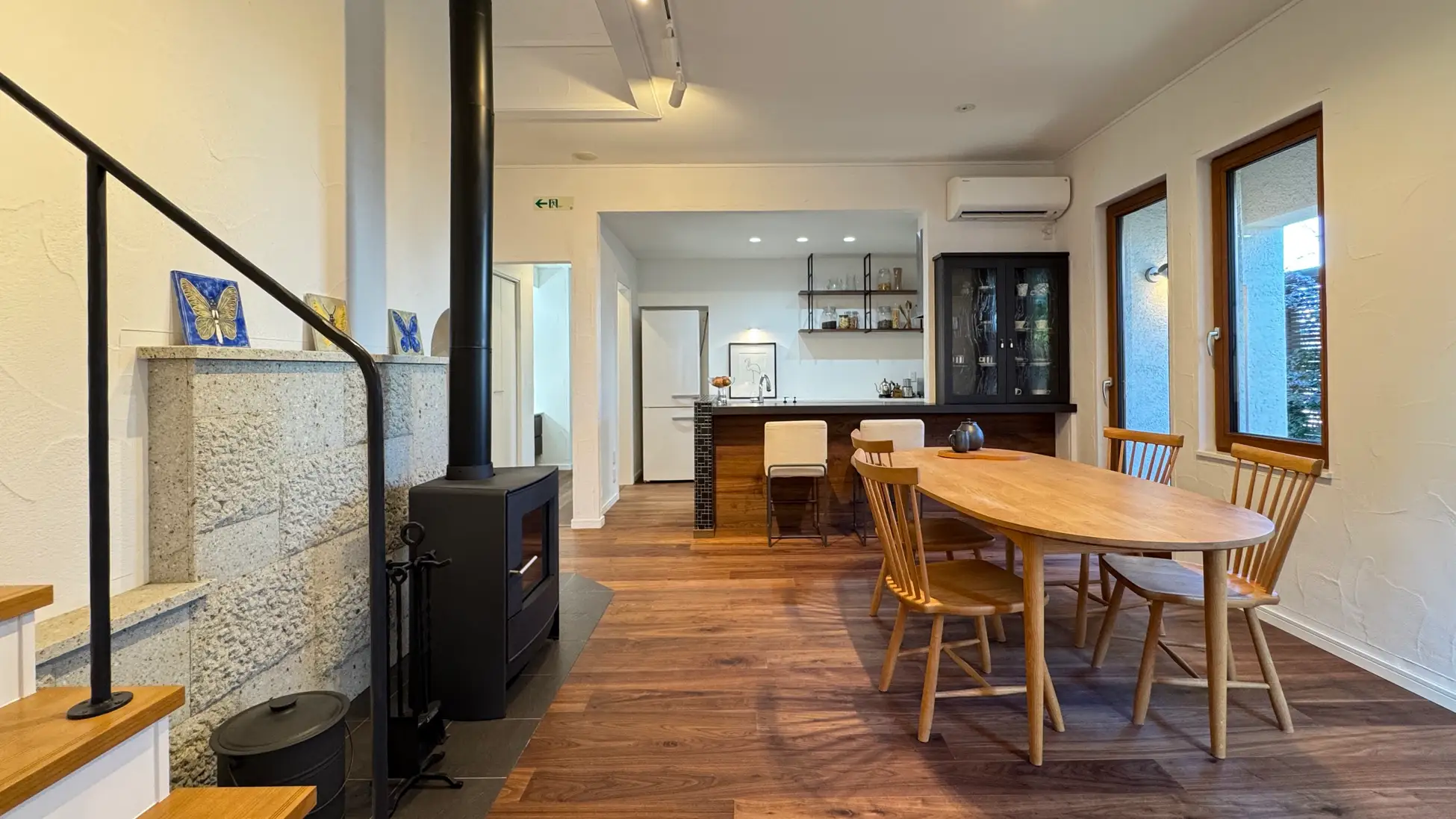 1階床材には重厚感と上質さを演出するウォールナットの三層フロアを敷き、建具はフラット仕様に変更。モダンなデザインに統一しました。さらに、壁面には室温変化を緩やかにする蓄熱塗り壁「エコナウォール」を広く用いることで、空間全体の質感と快適性を高めています。