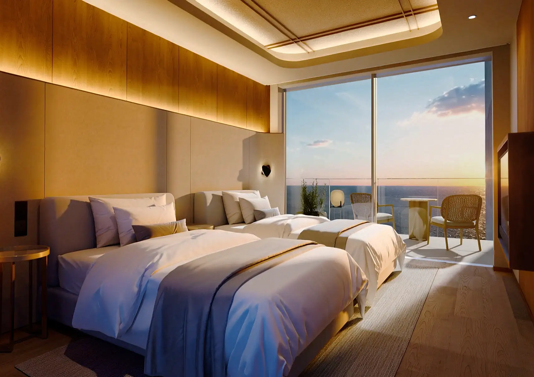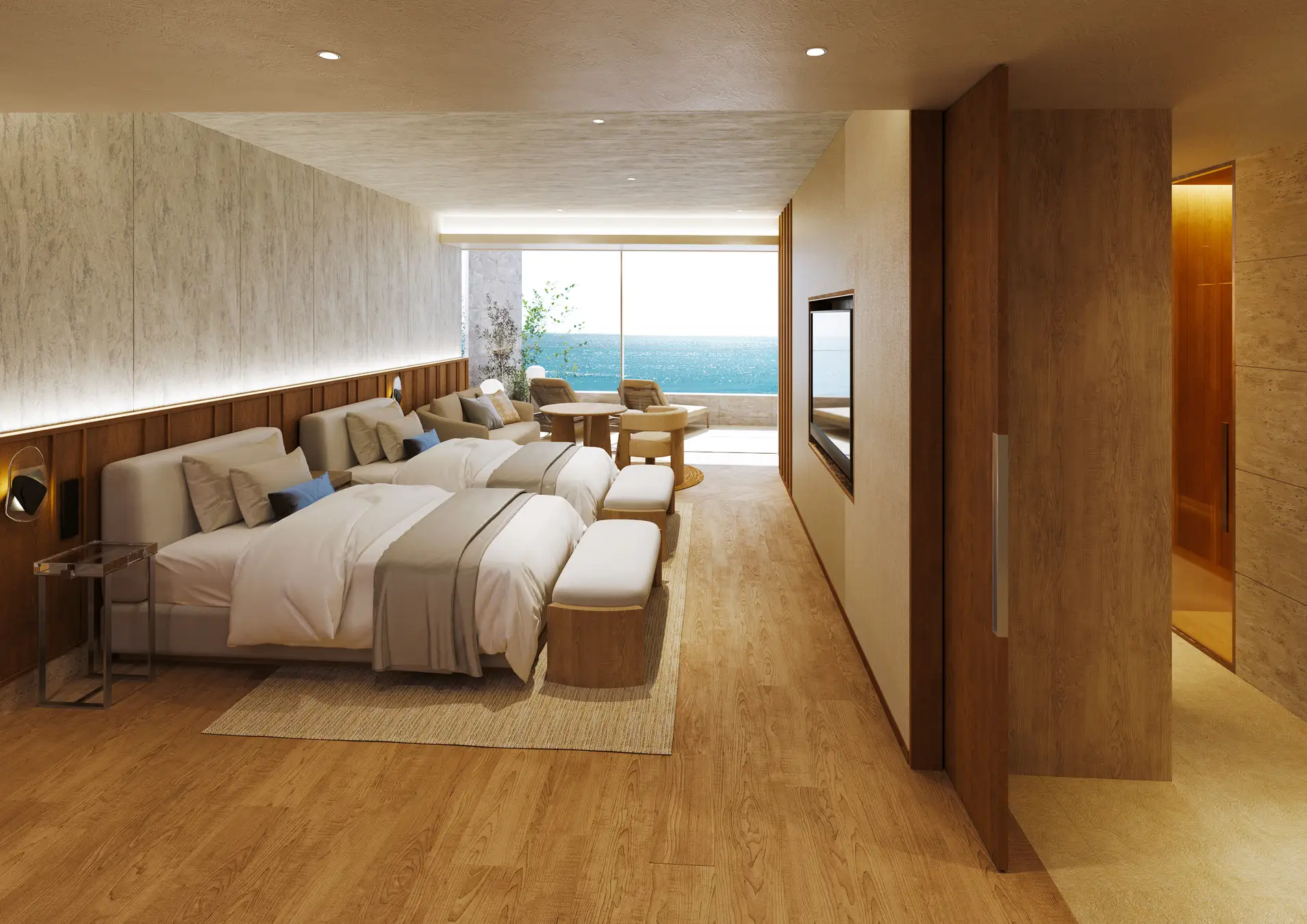広々とした空間で、目の前に広がる海のやさしさに包まれながら眠る、深い安らぎと癒しのひとときを提供します。