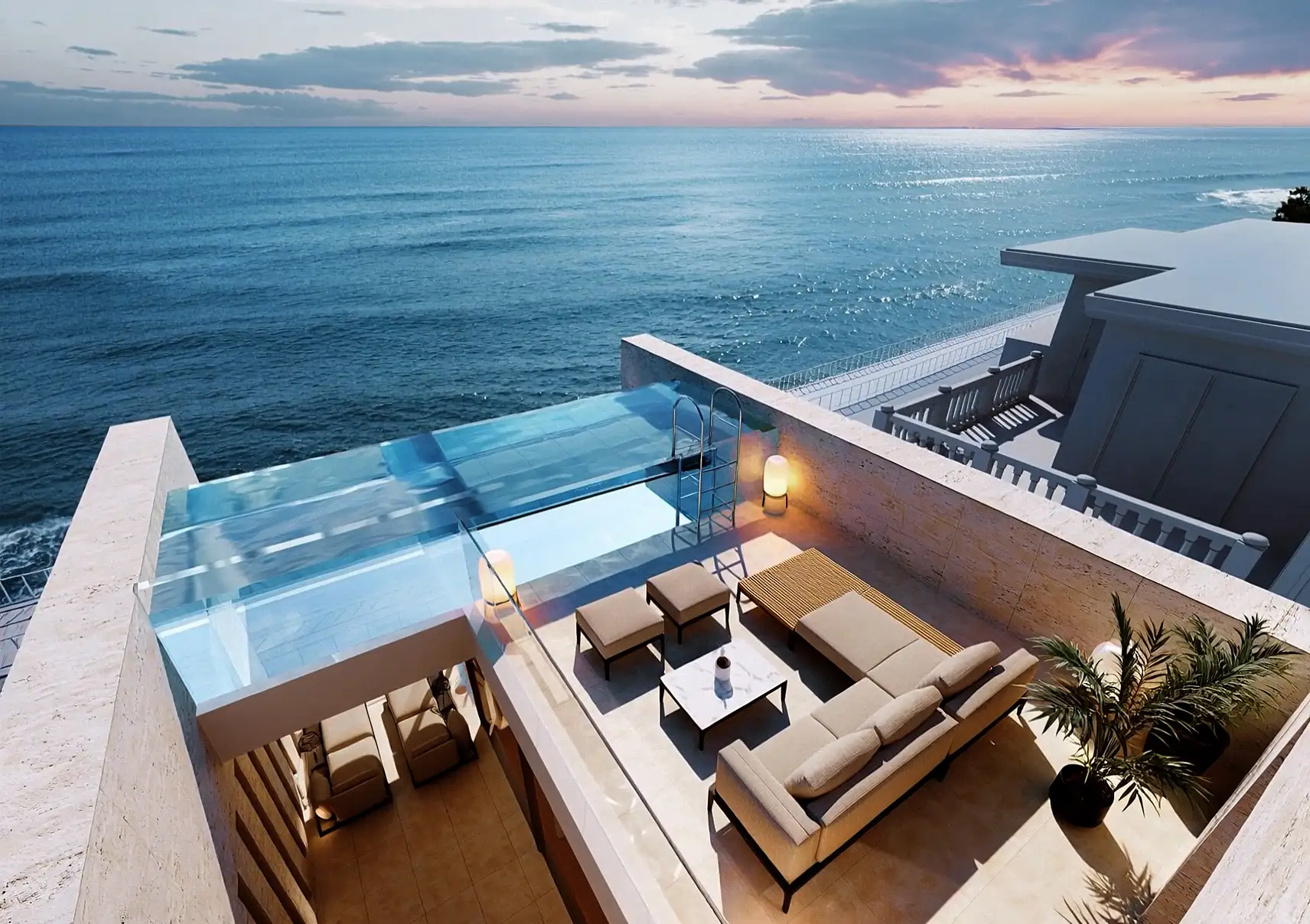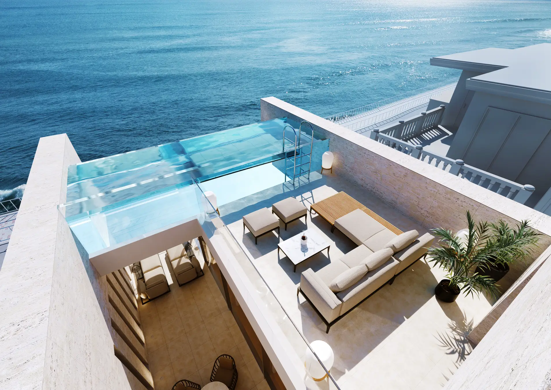ルーフトップテラスに設けられたアクリル製インフィニティプールは、本施設を象徴する特別な存在です。