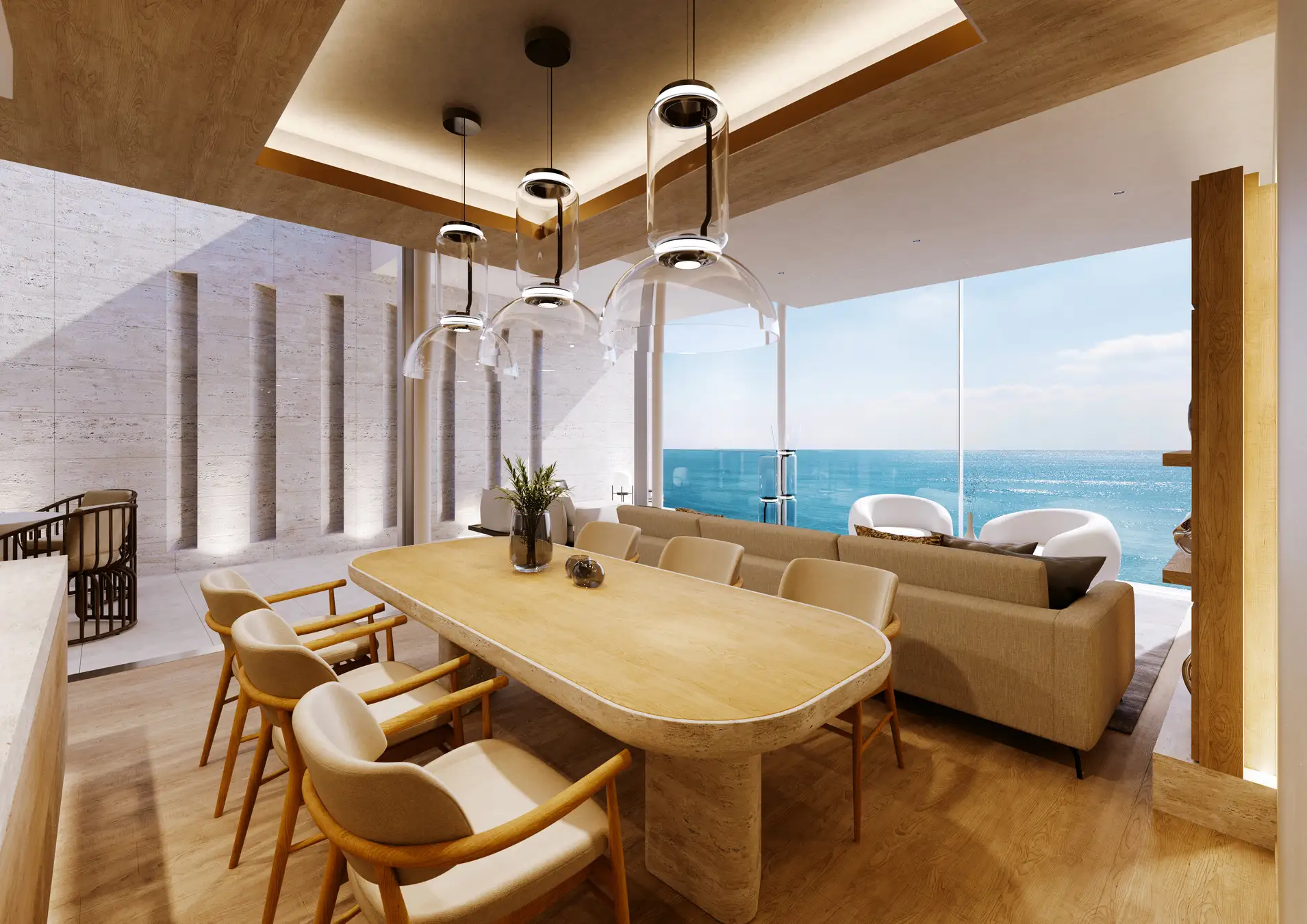 陽光と海の色を美しく引き立てる木材と石材を基調に、余白の美を活かした静謐な空間設計のリビング・ダイニング。