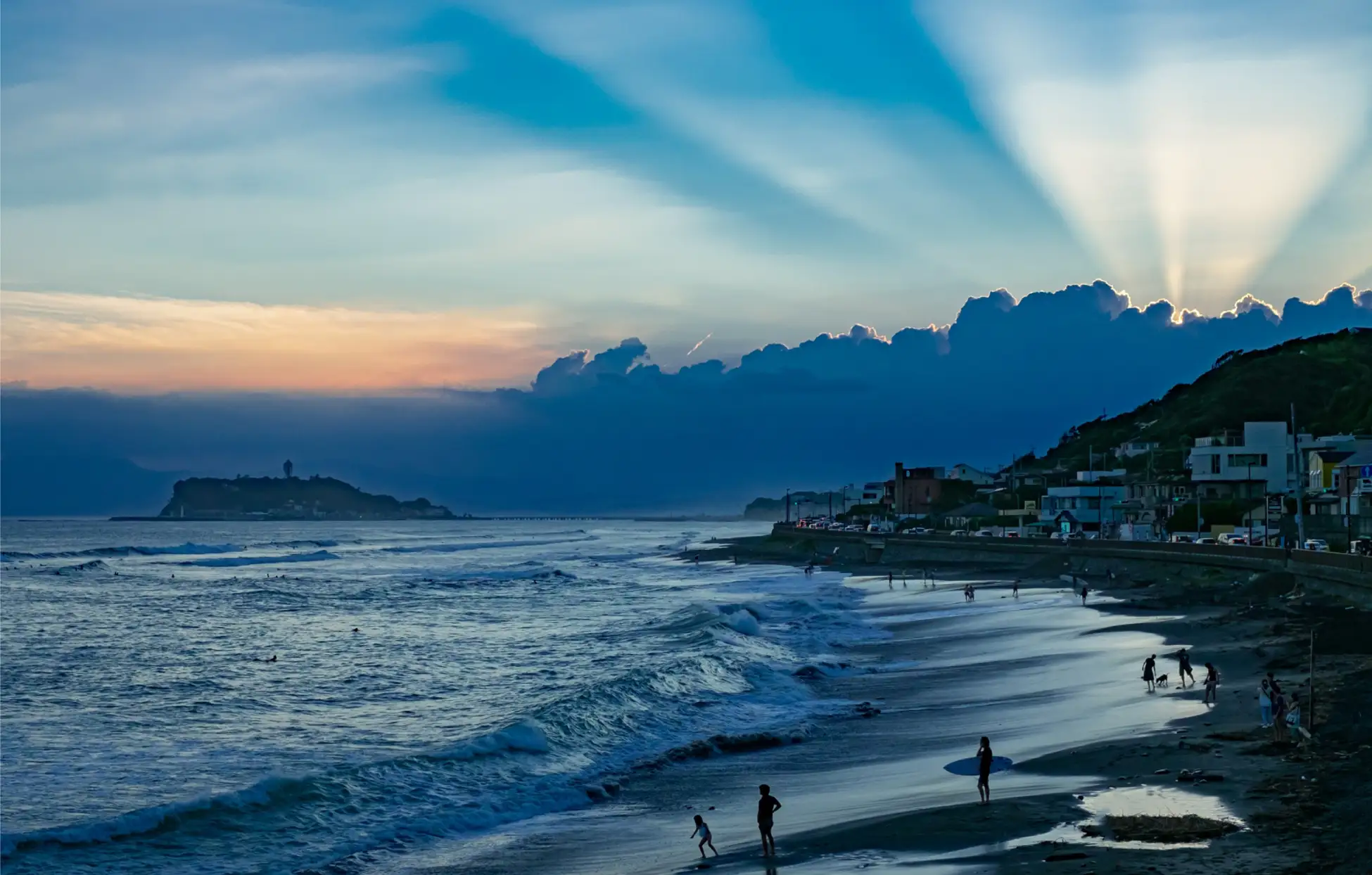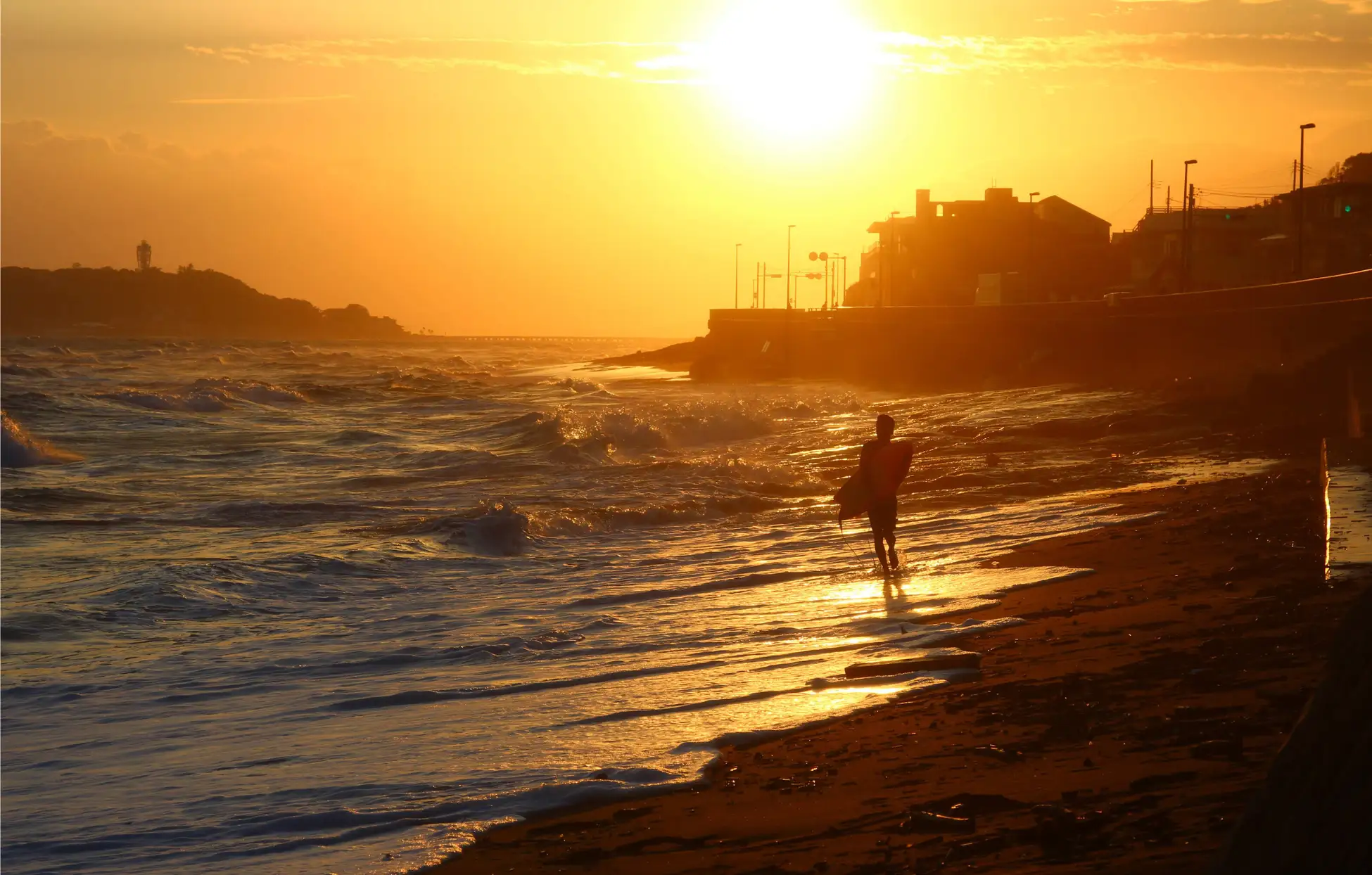 鎌倉中心部からほどよく離れた立地により、観光地でありながら喧騒を感じさせない静けさが保たれ、サーフカルチャーと歴史、自然が穏やかに溶け合うこの地は、夕刻には空と海が美しいグラデーションに包まれる鎌倉有数の夕景スポットとしても知られています。