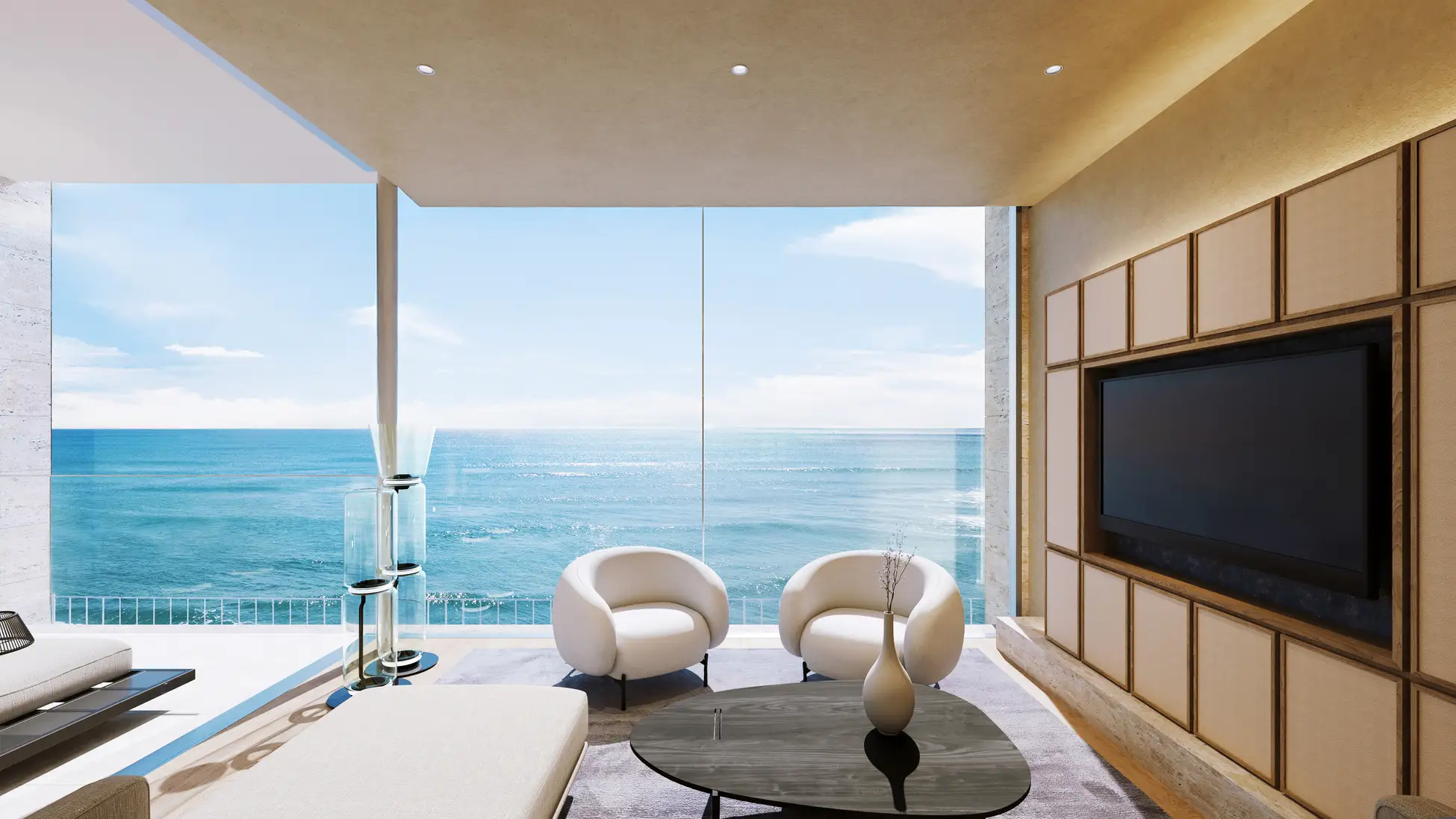 インテリアは、豊かな日差しと海の色を消さないことを重視し、重厚感よりも明るさと軽やかさのあるラグジュアリーを追求し、日の光、海、建築がひとつに溶け合う空間を目指しました。