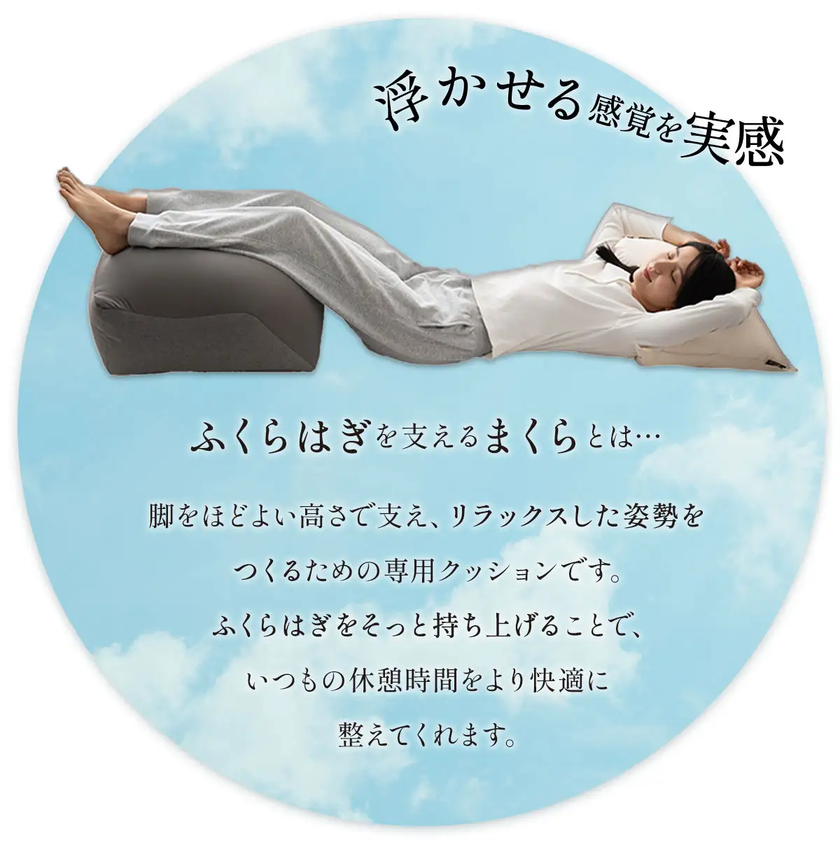 約1.5kgのボリューム感。長時間の立ち仕事やデスクワークでたまりやすい ふくらはぎのだるさ・重さをやさしくケアするために生まれた「ふくらはぎを支える枕」です。