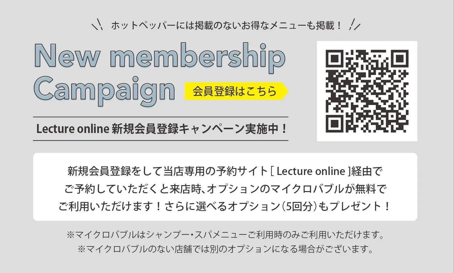 新規会員特典として、会員登録のうえで実際にリクレオンラインからご予約・ご来店いただくとシャンプーまたはヘッドスパメニューでご利用いただける「マイクロバブル1回無料とオプションチケット5回分」のプレゼント付き。
