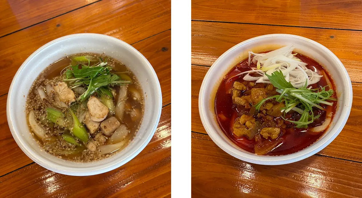 2024年12月の第5回埼玉うどんフェアに登場したうどんの名店が再び戸田ボートに降臨。延喜さんといえば、前回にも出品された『特製かれぇうどん』があまりにも有名だが、今回は『鶏肉とネギの胡麻かけうどん』と『大久保レッド』の2種類のうどんが登場。前者は鶏肉とネギを油で炒め、すりごまをたっぷりかけた逸品。かたや後者は千葉県のご当地ラーメンをイメージ。豚肉とひき肉と玉ねぎをラー油で揚げ煮した具材が乗った贅沢なうどんだ。
