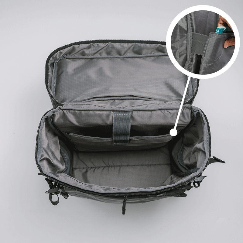 上部からの出し入れに加え、前面が大きく開く2WAY構造を採用。一番下に入れたお弁当や着替えも上の荷物をかき分けることなく取り出せます。