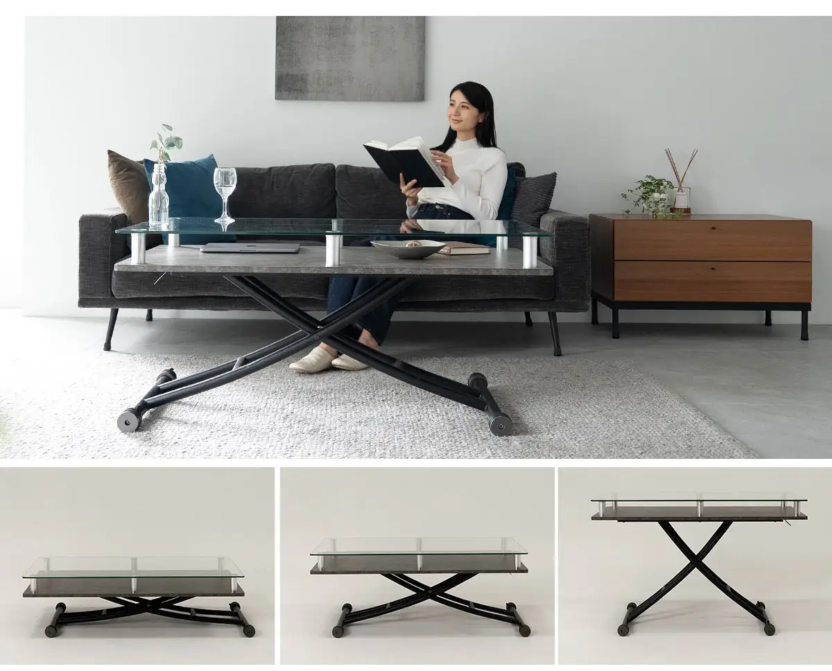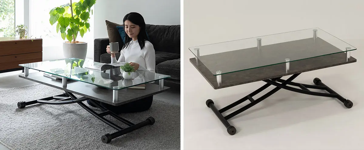 ガラストップ天板による高級感と、昇降機能による高い実用性を兼ね備えたリビングテーブル。