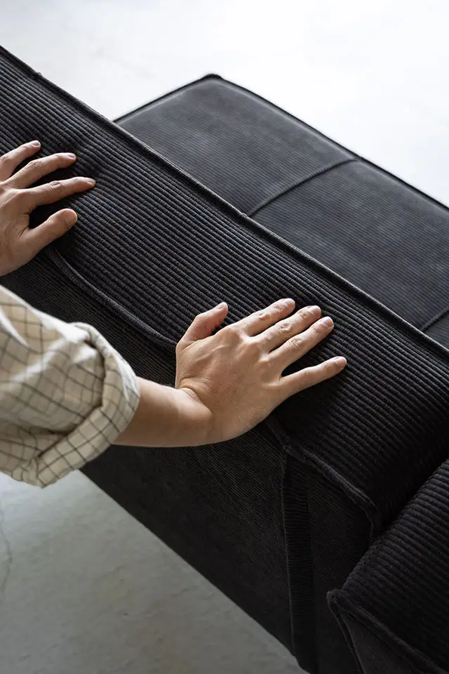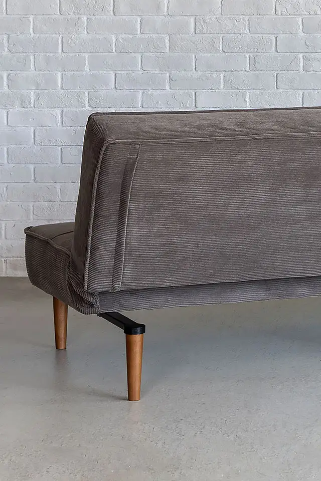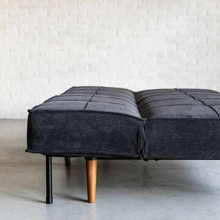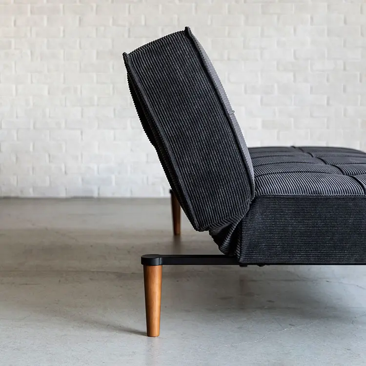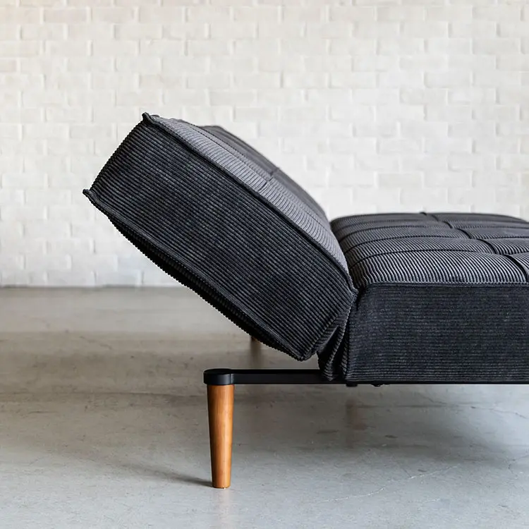 ベッドへの切り替えは、背もたれ裏に収納された専用脚を引き出し、背を倒すだけ。ソファ使用時は脚を背面内部に格納できるため、すっきりとした外観を保ちます。
