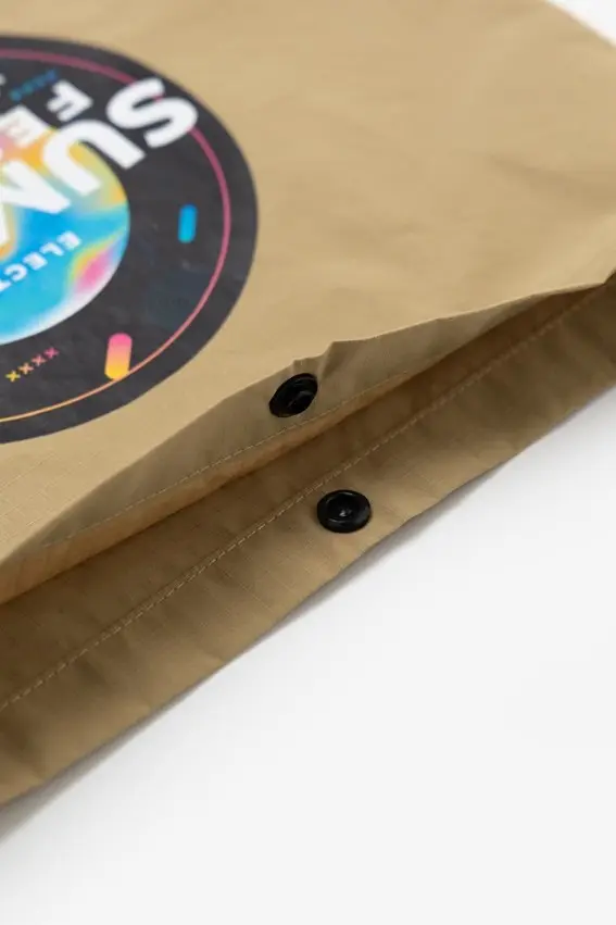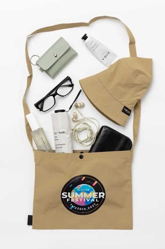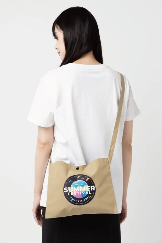 シンプルで扱いやすい生地を採用し、さまざまなスタイルやシーンにマッチします。イベントやフェス、アウトドア関連のオリジナルグッズとしてはもちろん、日常使いもできるデザインで、長期的な宣伝効果も期待できます。