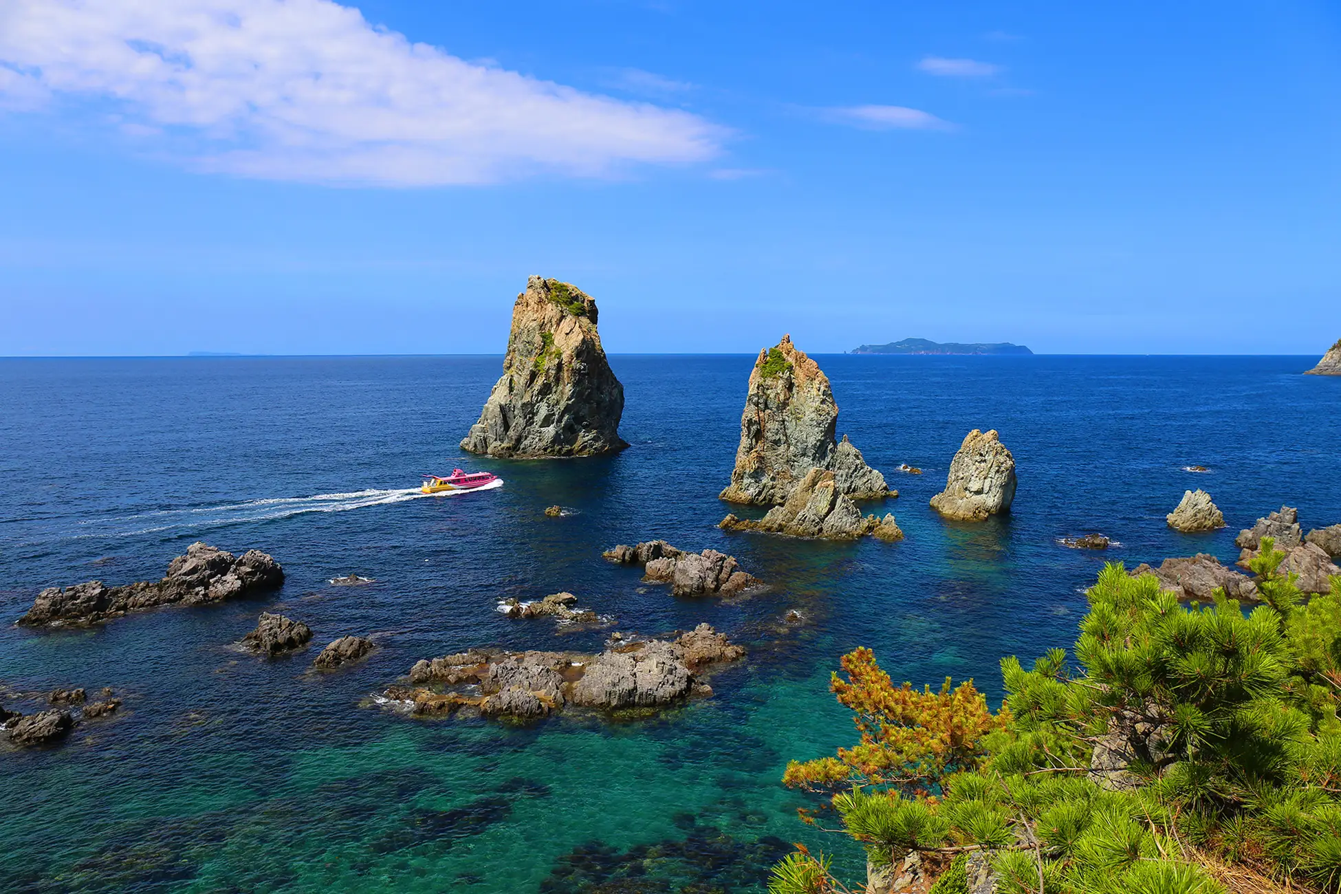 日本海沿岸一帯の豊かな漁場では、古くから捕鯨や漁業が盛んに行われ、多くの漁港が点在しています。北長門海岸国定公園に指定される海岸線では、日本海の荒波に浸食された岩と白い砂浜が出入りし、変化に富んだ雄大な自然景観を生み出しています。中でも紺碧の海上に奇岩怪石が連なる海上アルプス「青海島」、遥か日本海を展望できる「千畳敷」、海に浮かぶ「棚田」のシルエット、本州最西北端に突き出した「川尻岬」の緑青色の海などは、訪れる人々を魅了します。