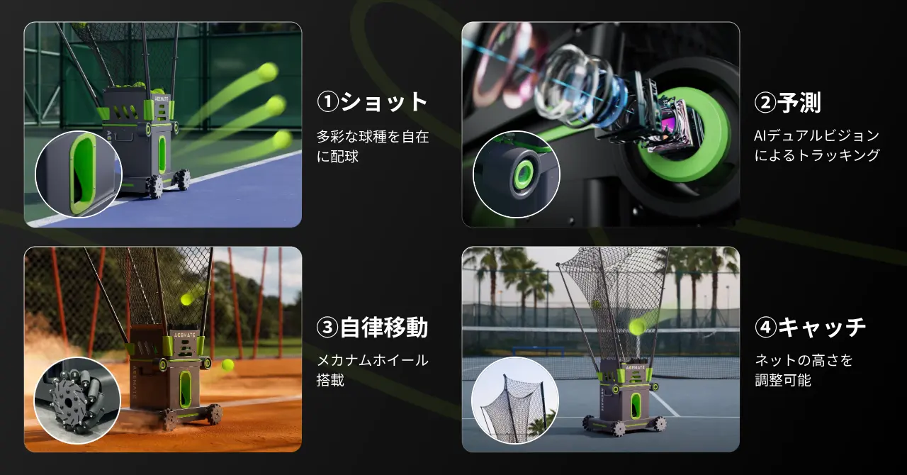 AIと4Kカメラによるデュアルビジョンで放たれた打球を瞬時に読み取り、弾道を精密に予測。4輪のメカナムホイールが、テニスコートを最高秒速約5mという俊敏なフットワークで縦横無尽に駆け巡ります。