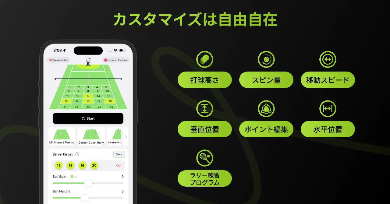 ボールマシンモードでは、発球の間隔、速度、方向、スピン、全てのショットをカスタマイズでき、あなたの今の課題にぴったりの練習環境を作り出せます。さらに、左右への振り回し、深浅のコンビネーション、ボレー特化など、実戦的なプリセットメニューも充実。ワンタップで本格的なトレーニングを開始でき、最短距離での上達を支えます。
