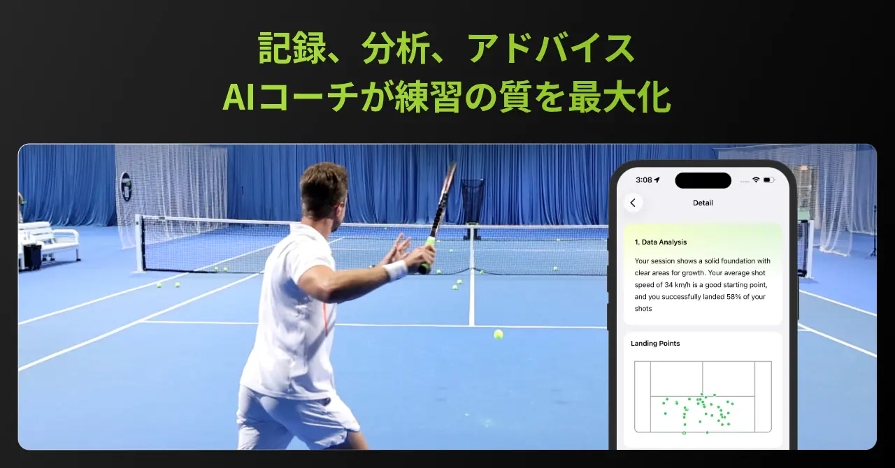 AIがリアルタイムでショットの最大/平均速度、ネット通過時の高さ、イン・アウトの判定、着弾点を分析し、アプリに記録。分析したデータに基づき、AIがトレーニングの方向性をアドバイス、テニススキルを次のレベルへと引き上げるサポートをします。