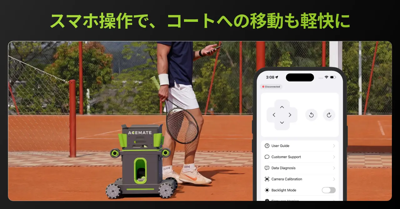 Acemateは、単にボールを一定の間隔で打ち出す従来の「球出し機」とは一線を画します。4つのメカナムホイールによる360°全方位への俊敏な移動と、プレイヤーの打球をリアルタイムで解析するデュアルAIビジョンを搭載。返球に反応して自らポジションを取り、実戦さながらのテンポで「生きたボール」を放つ、世界初※のラリーができるAIテニスロボットです。