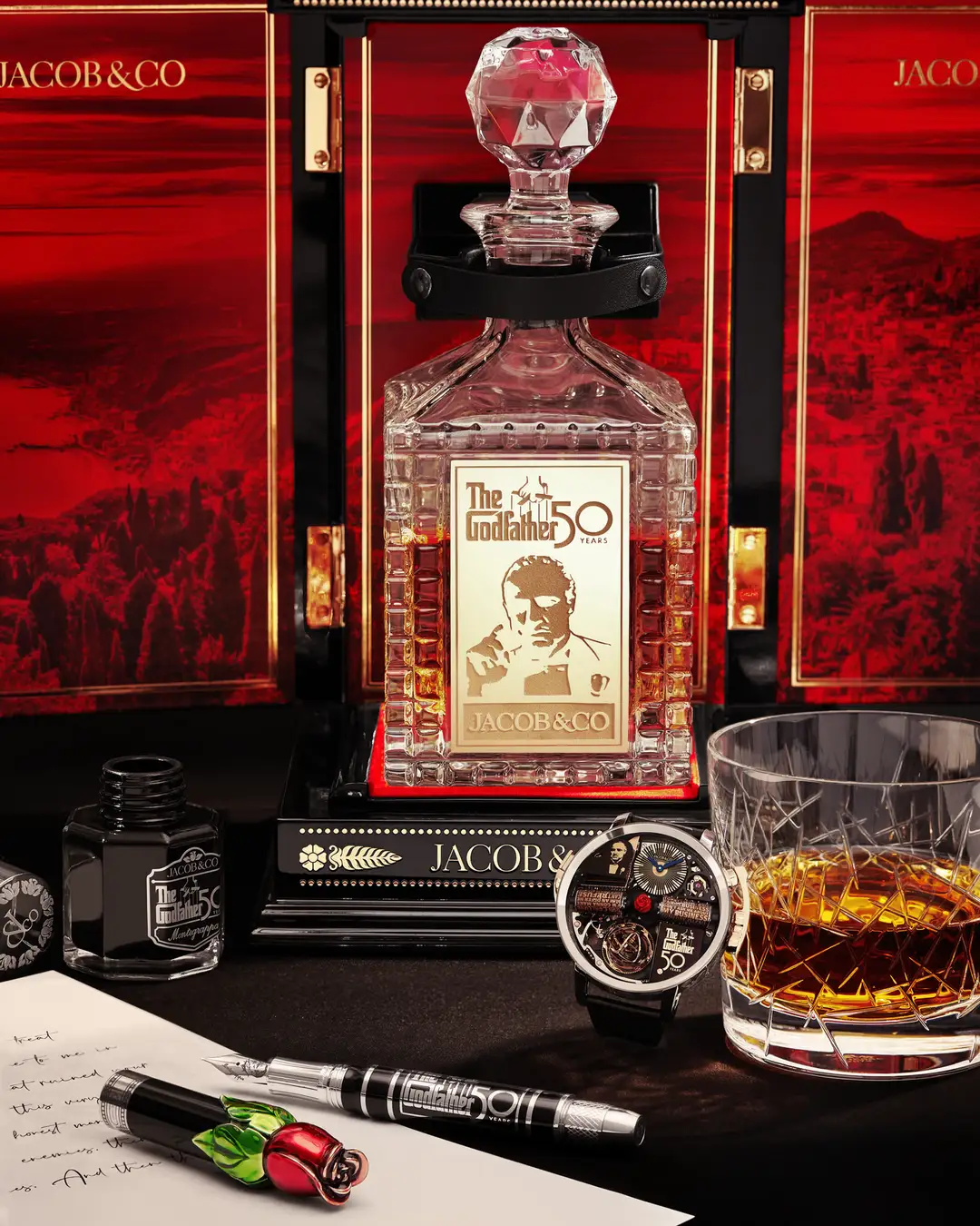 さらに、特別仕様の万年筆とクリスタルデキャンタが付属し、“ドンの書斎”という重厚な世界観を完成させています。時計だけでなく、映画に深く根ざした象徴的アイテムを一式として楽しめる点も、アニバーサリーモデルならではの魅力となっています。