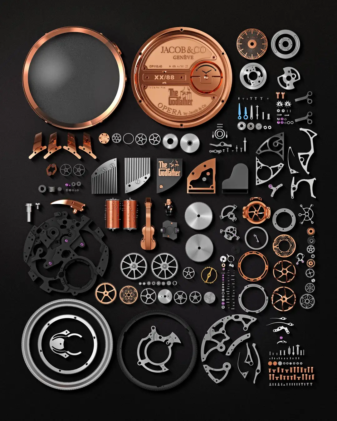 対して、ゴッドファーザーという映画の世界観と、ジェイコブ&コーならではの複雑機構の結びつきを極限まで高めたアートピースとしては、2020年に発表された「オペラ ゴッドファーザー ミニッツリピーター」が挙げられます。ミミニッツリピーターによる時刻の音色と、ミュージックボックスが奏でるテーマ曲が同居する唯一無二のモデルで、“時を告げる音”と“物語を奏でる音”が融合した音響芸術の到達点と言えます。音色の重層性と、構造の複雑さが極めて高い次元で融合し、『ゴッドファーザー』の世界がより深く、より立体的に腕元で息づく作品となっています。