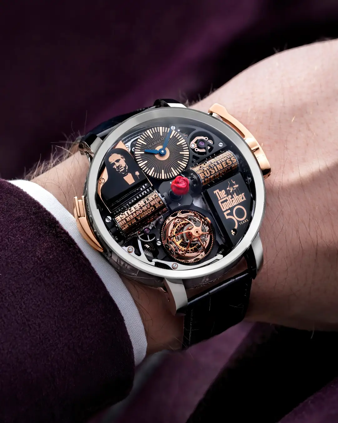 ジェイコブ&コーは、パラマウント・ピクチャーズと時計ブランドとして史上初のライセンス契約を締結し、映画『ゴッドファーザー』の世界観・タイトル・テーマ音楽を腕時計というフォーマットに落とし込む、極めて稀有なメゾンです。