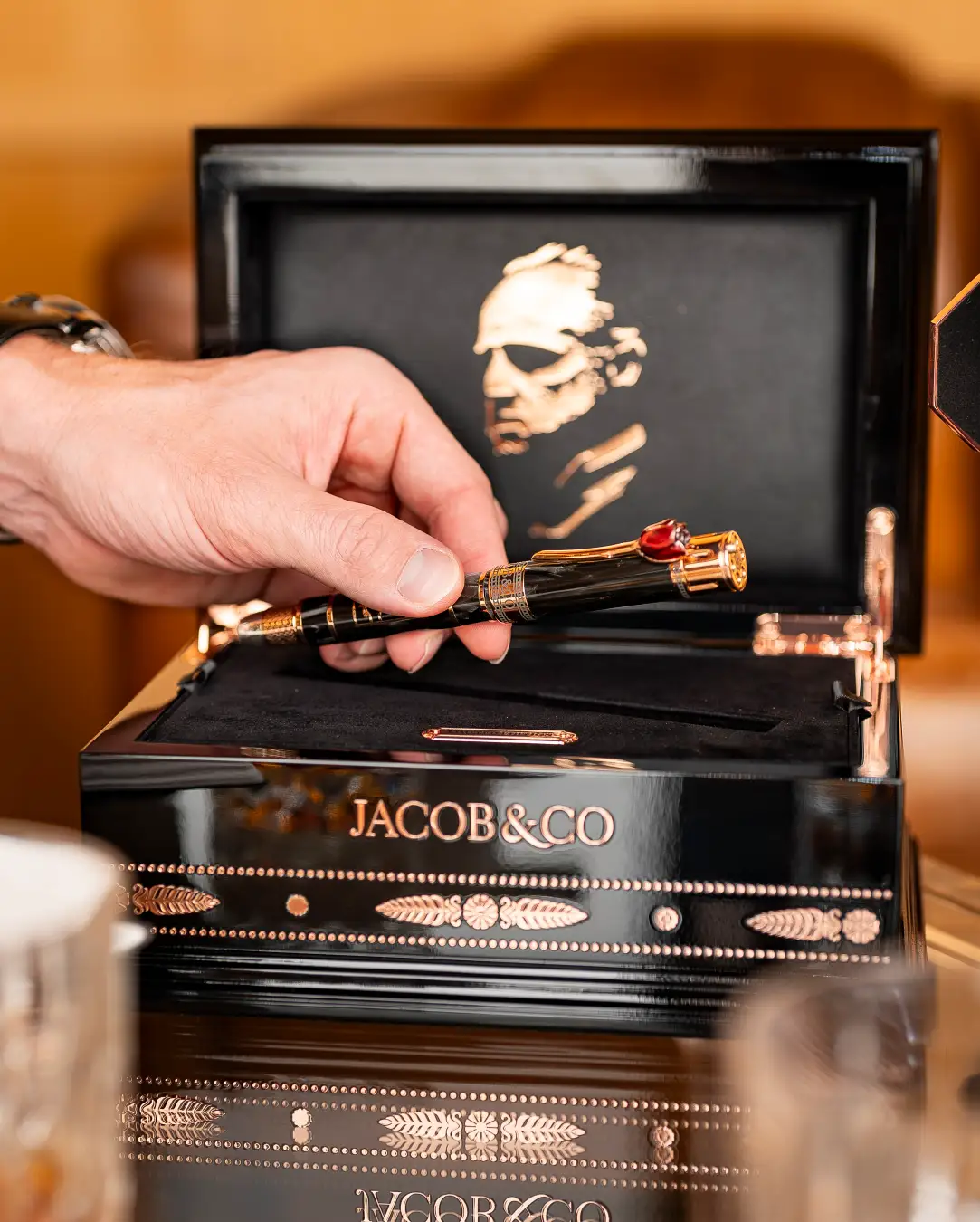 さらに、同コレクションにはクリスタル製デキャンタもラインとして存在し、時計・筆記具・デキャンタが揃うことで“ドンの書斎”を思わせる統一された世界観が完成します。腕元だけでなく、デスクやリビングまでも映画の美学が息づく構成です。