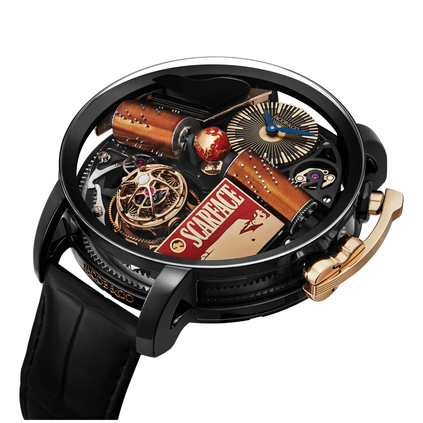 なかでもユニバーサル・ピクチャーズとの正式ライセンスにより誕生した「オペラ スカーフェイス」は、49mmケースに3軸トゥールビヨンとミュージックボックスを搭載し、世界観を力強く表現しています。