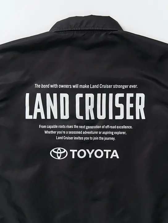 デザインは、ランドクルーザーのロゴを同色刺繍でさりげなく配置し、DuPont社の「Tyvek」で仕立てたミルスペック調タグをアクセントにしました。