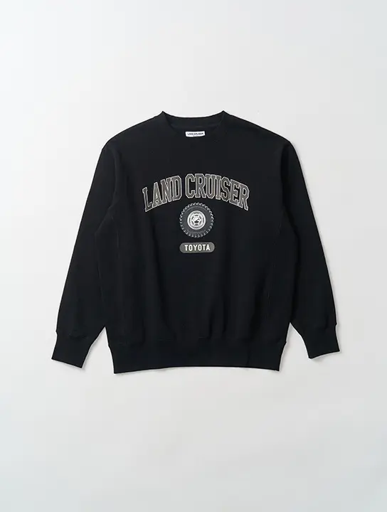 <クラシックなパターンに、カレッジロゴ風にアレンジしたランドクルーザーのシグネチャーホイールを組み合わせた、ヘビーウェイトスウェット>