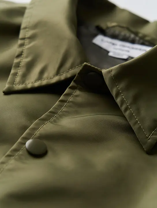 ナイロンタフタが用いられることが多いコーチジャケットに、よりハイゲージで高密度で織り上げた