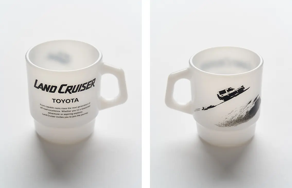 カラーにはFire-Kingを代表する「ミルクホワイト」を採用。形状はスタッキング可能な「スタッキングマグ」をベースに、砂丘(DUNE)を駆け上がるランドクルーザーのイラストをあしらった数量限定デザインです。