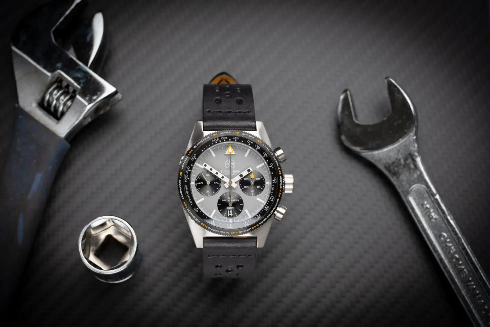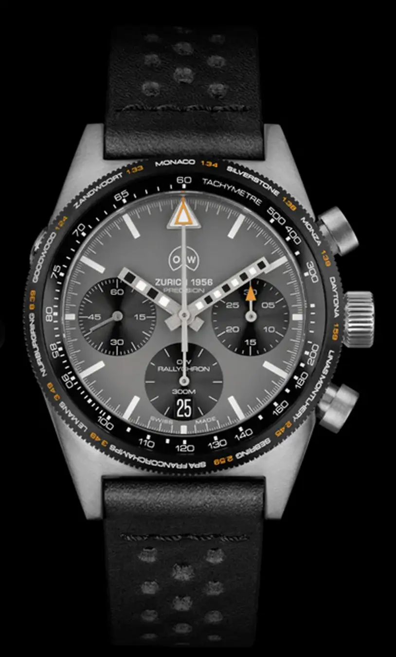 オレッヒ&ワイス(O&W)のRallychron(ラリークロン)/Rallychron CA(ラリークロン CA)は、1960年代のカーレース黄金期をリスペクトして発売されました。もっとも特徴的なのはモチーフにチェッカーフラッグを引用したインパクトあるバーダイアル。加えて数々のドラマを創り出した11ヶ所のサーキットでの「理論上の最速ラップタイム」を刻みつけた回転ベゼル。遊び心溢れたデザインですが、そのベゼルの内周にはタキメーターが配置され、O&Wの機能を重視した姿勢に抜かりはありません。