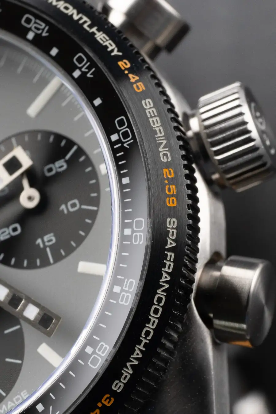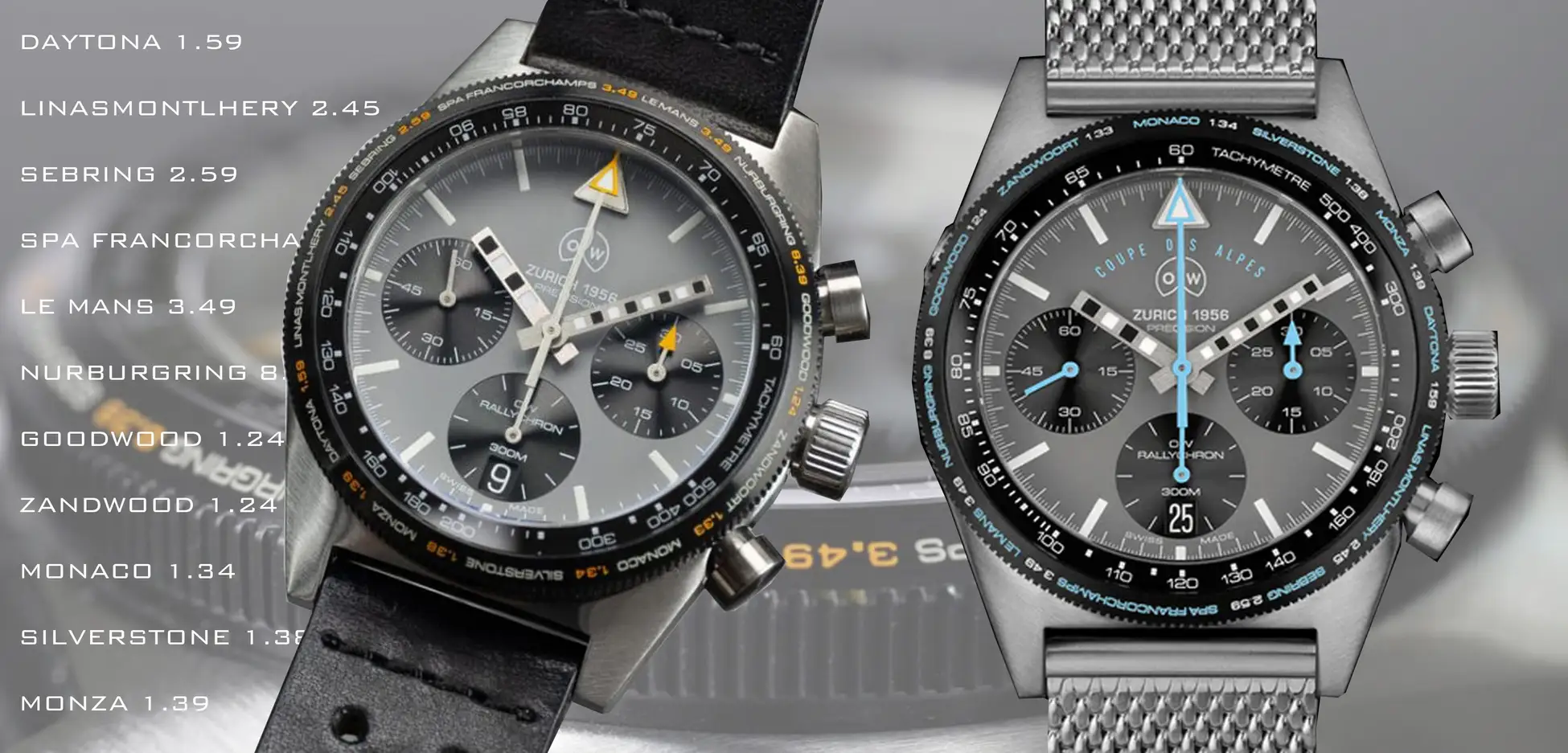 「ラリークロン」はオレッヒ&ワイスのクロノグラフとしての高機能、高品質は担保しつつ、ベゼル外周には聖地とも言える11のサーキットそれぞれの”理想的な最速ラップ(perfect lap)”が刻印されているという極めてナラティブなもの。