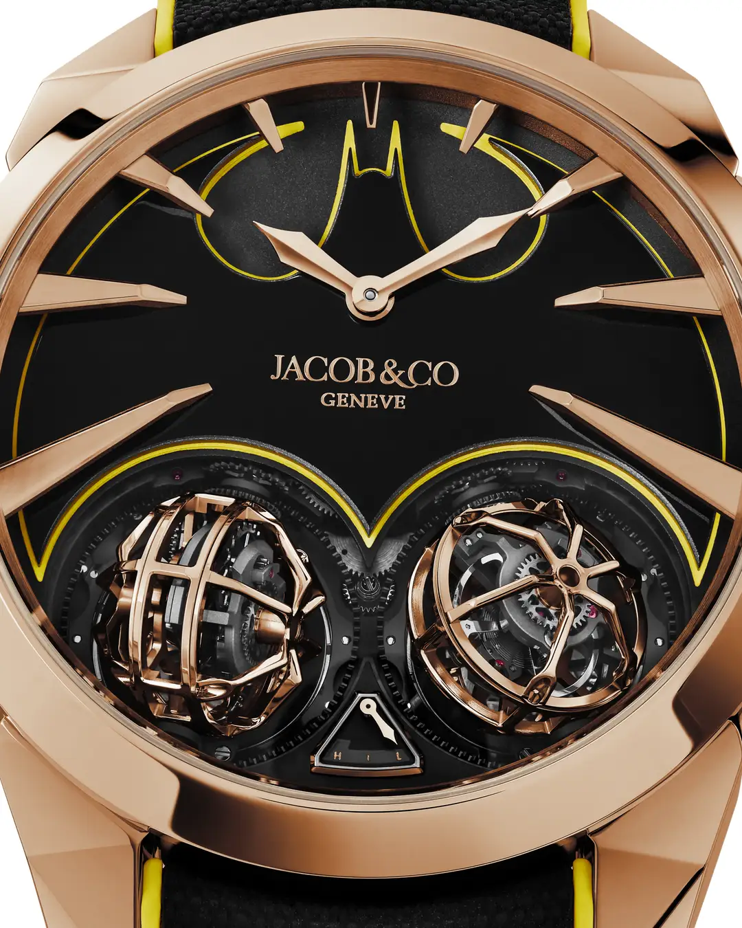 バットシグナル型のオニキス製ダイヤル、バットラングを想起させるハンド、グラップリングフックを思わせるトゥールビヨンのキャリッジ