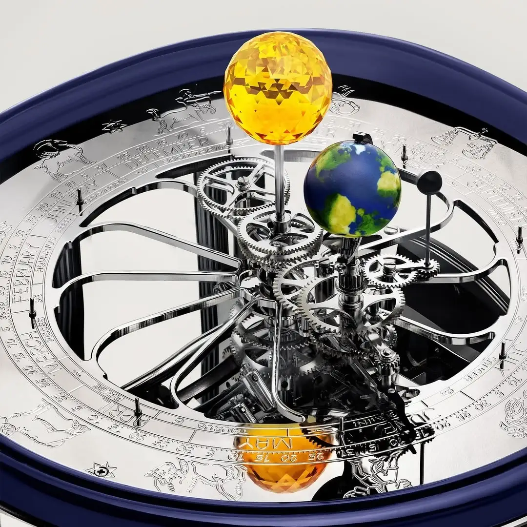 ジェイコブ&コーは、アストロノミアの世界観をクロックという形式でも拡張しています。ドイツの名門クロックメーカー、ヘルムレとの協業によって誕生した アストロノミア テラリウムは、太陽・地球・月の相対関係を機械仕掛けで可視化した天体モデルです。4本のアームが中央軸を中心に回転し、時刻表示、天体、そして象徴的なトゥールビヨンが連動する構成となっています。