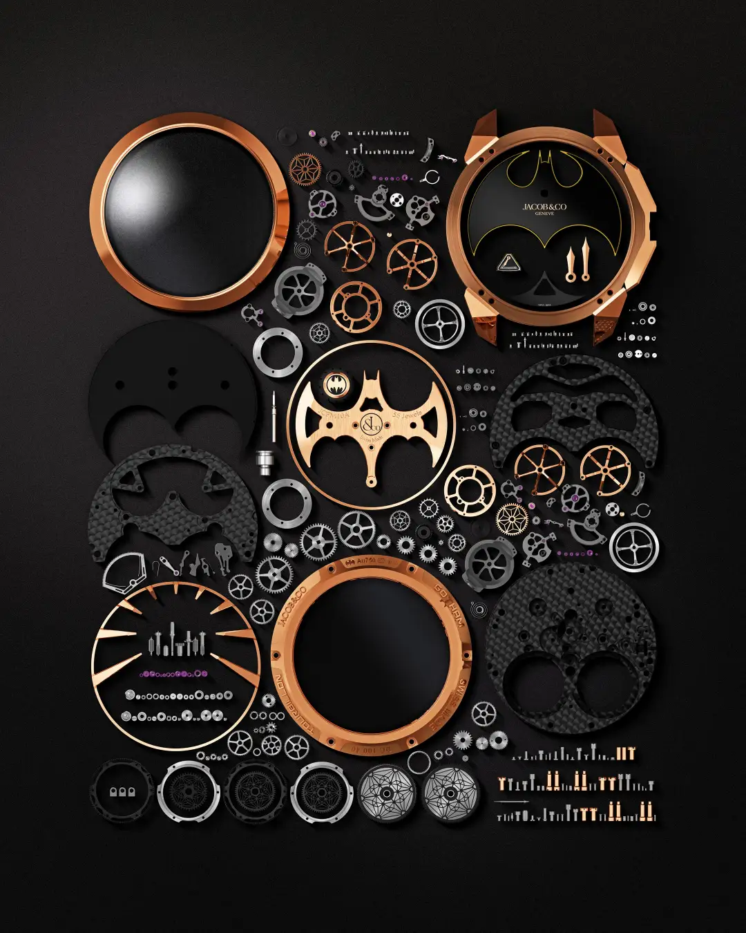 劇中のモチーフは単なる表面的な装飾に留まることなく、構造体や部品形状そのものとして時計の成立に深く組み込まれました。漆黒のDLCチタンと優美なローズゴールドが提示する二つの表情、そしてウォッチの世界観を空間へと広げるクロックの存在。これらはすべて、バットマンの物語とジェイコブ&コーの技術が共有する美意識、そしてプロダクトに対する真摯な理念を突き詰めた結果に他なりません。