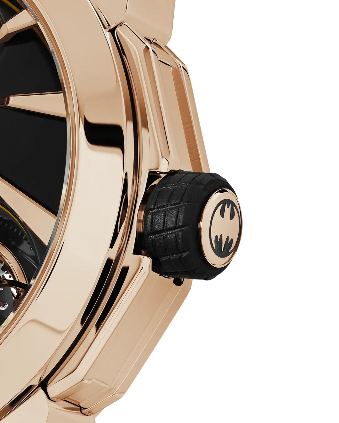 リューズには巻き上げ効率を上げる機能部品としてラバーが取り付けられ、その形状はバットモービルのタイヤをモチーフとしている