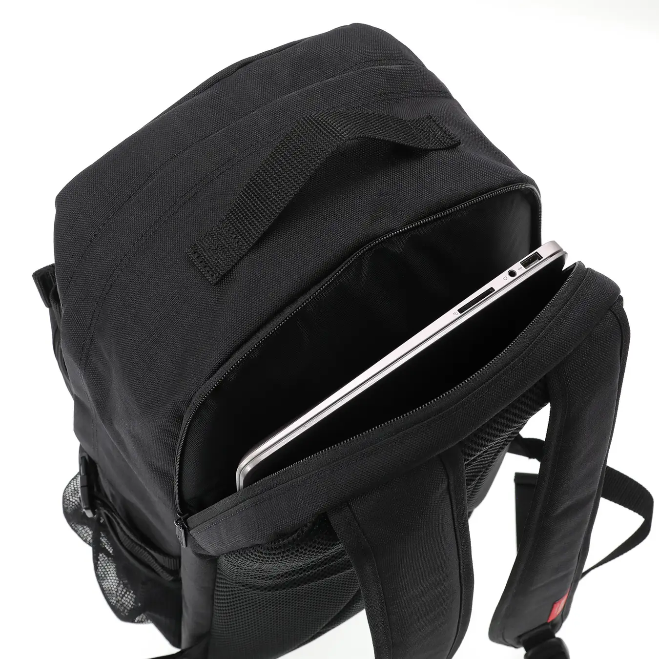 ・片面のメッシュポケット上部には長さのあるものを収納した際に固定できるバックル付き