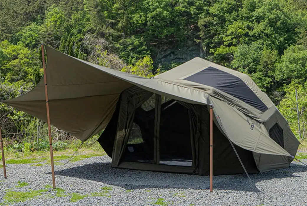 coodyの大型エアテントシリーズ最新モデルです。八角形のドーム型テントと扇型に広がる延長タープは取り外しが可能。強風にも強い安定性と、大人数でも快適に過ごせる独自のシルエットが特徴的です。ファミリーキャンプはもちろん、グルキャンやイベントでも圧倒的な存在感でキャンプ場での高い注目度も間違いなしです!