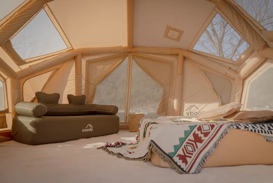 簡単設営を実現するエアポール構造と、広々とした3.8m四方の室内空間を備えた、