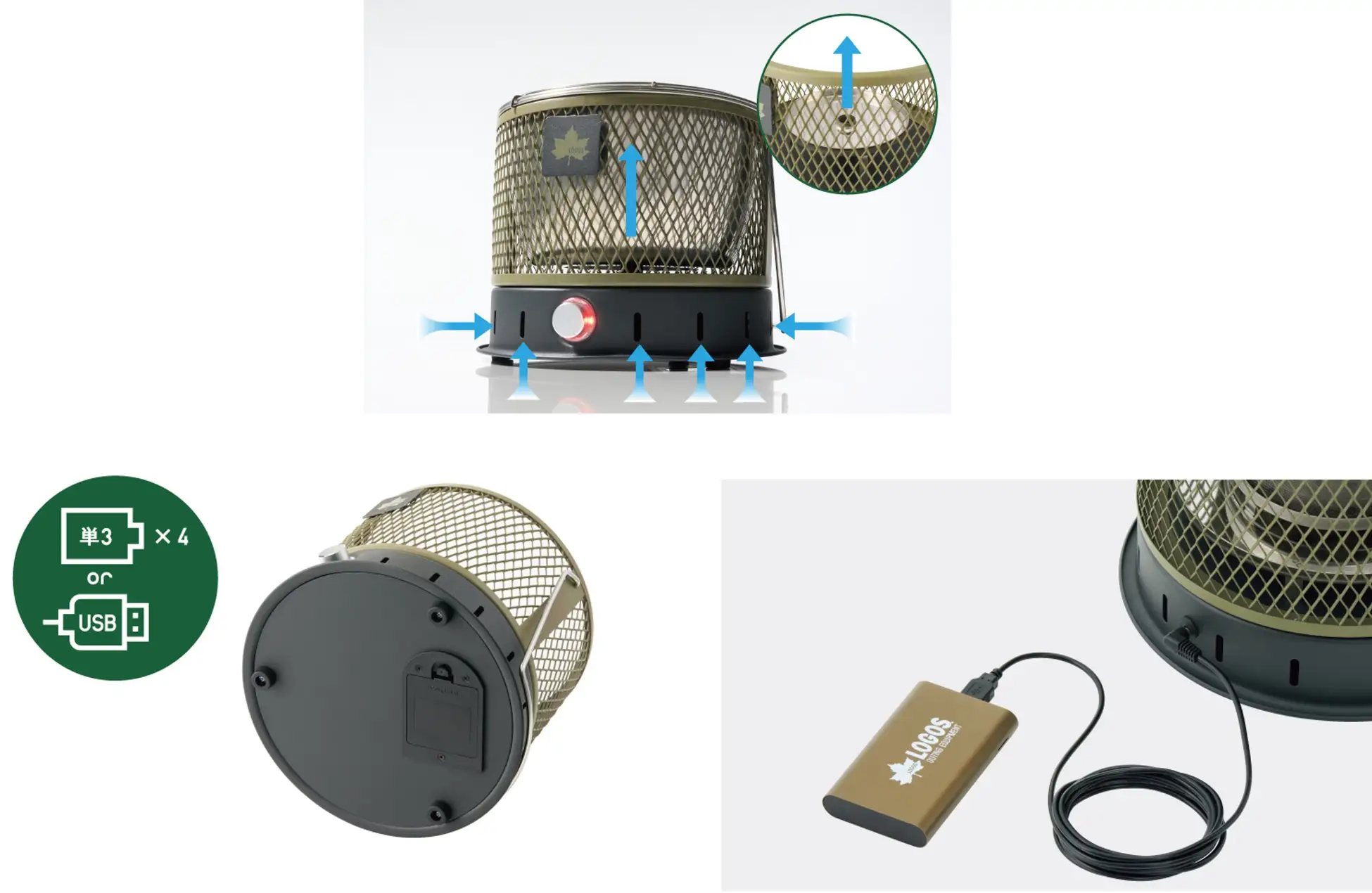 送風機能はダイヤル操作で風量調節が可能なため、調理時は強火、暖房時は安定運転など、シーンに合わせた火力コントロールが可能。電源は単三アルカリ乾電池とUSBの両方に対応。モバイルバッテリーからも給電でき、電源環境を選ばずアウトドアでも柔軟に使用可能。