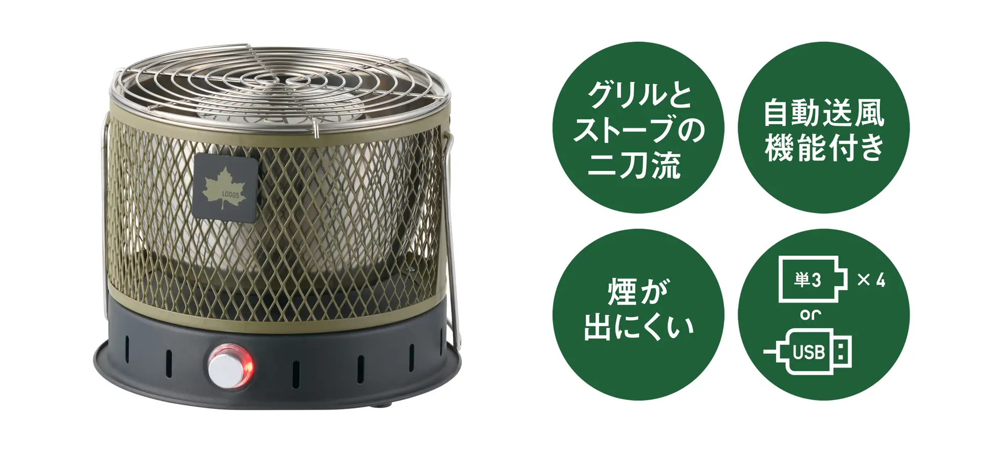 株式会社ロゴスコーポレーション(本社:大阪市住之江区、代表取締役社長:柴田茂樹)が展開するアウトドアブランドの「LOGOS」は、自動送風機能を搭載した、高火力ストーブと無煙BBQグリルの2役を1台で楽しめる暖房グリル「LOGOS 無煙 メシ暖房グリル(ファンの力で火力抜群)」を、2026年1月29日(木)より新発売いたします。