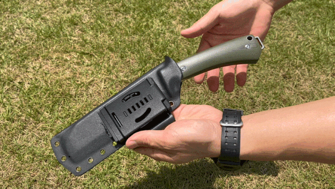 鞘(シース)には軽くて丈夫なうえメンテナンスがほとんど不要なカイデックスを採用。ハンドルを握って親指で押せばロック解除できるようになっており、ナタを確実にホールドしつつ片手で簡単に抜き差しできる構造。カチッとロックするまで差し込めば、振り回しても外れない安心設計。