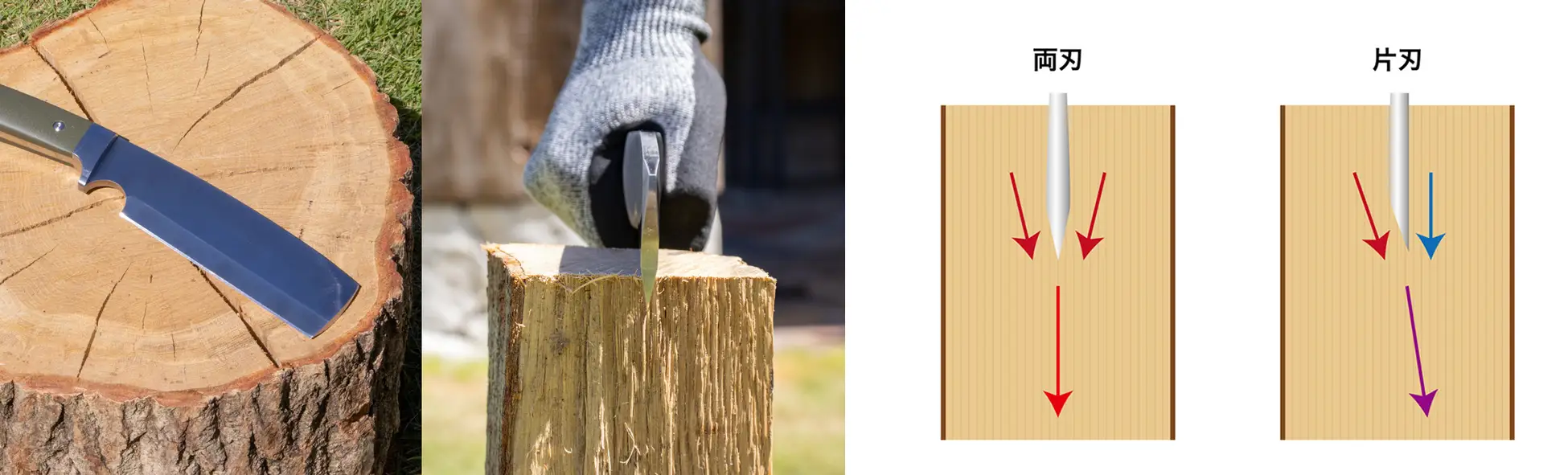 キャンプ場でも山でもフィールドを選ばずに気兼ねなく使える安全性を重視し、ブレードの先端が尖っていない「角ナタ」の形を採用しました。怪我防止用のヒルト(ストッパー)付きのため、安全に使用できるほか、細かな作業でも使いやすいよう、ブレードに人差し指をかけられる窪み(フィンガーチョイル)があり、持ち方を変えるとフェザースティック作成などの細かな作業にも対応します。