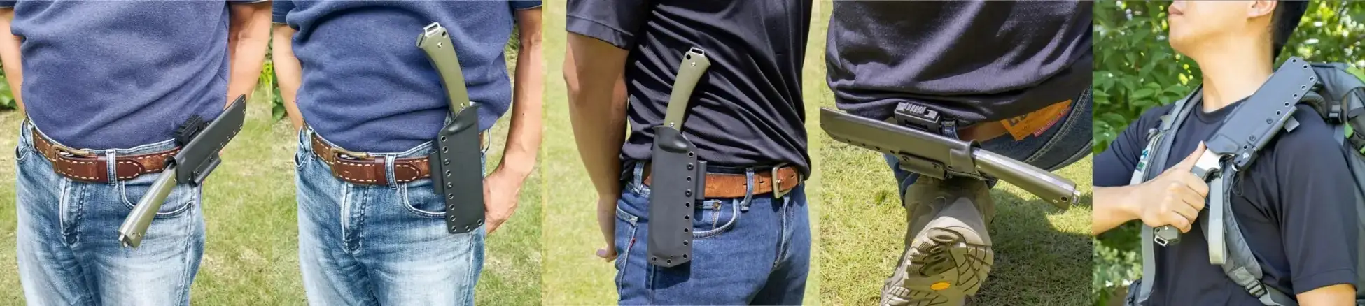 鞘(シース)には、軽くて丈夫で汚れても丸洗いができる「カイデックス」を採用しました。ハンドルを握って親指で押せばロック解除できるので、ナタを確実にホールドしつつ片手で簡単に抜き差しできます。ベルトホルダーを取り付ける向きが変更可能なので、左利きにも対応するほか、様々なパターンで装備できます。別売りのファイヤーストライカーセットを取り付けられるホルダーも搭載しています。