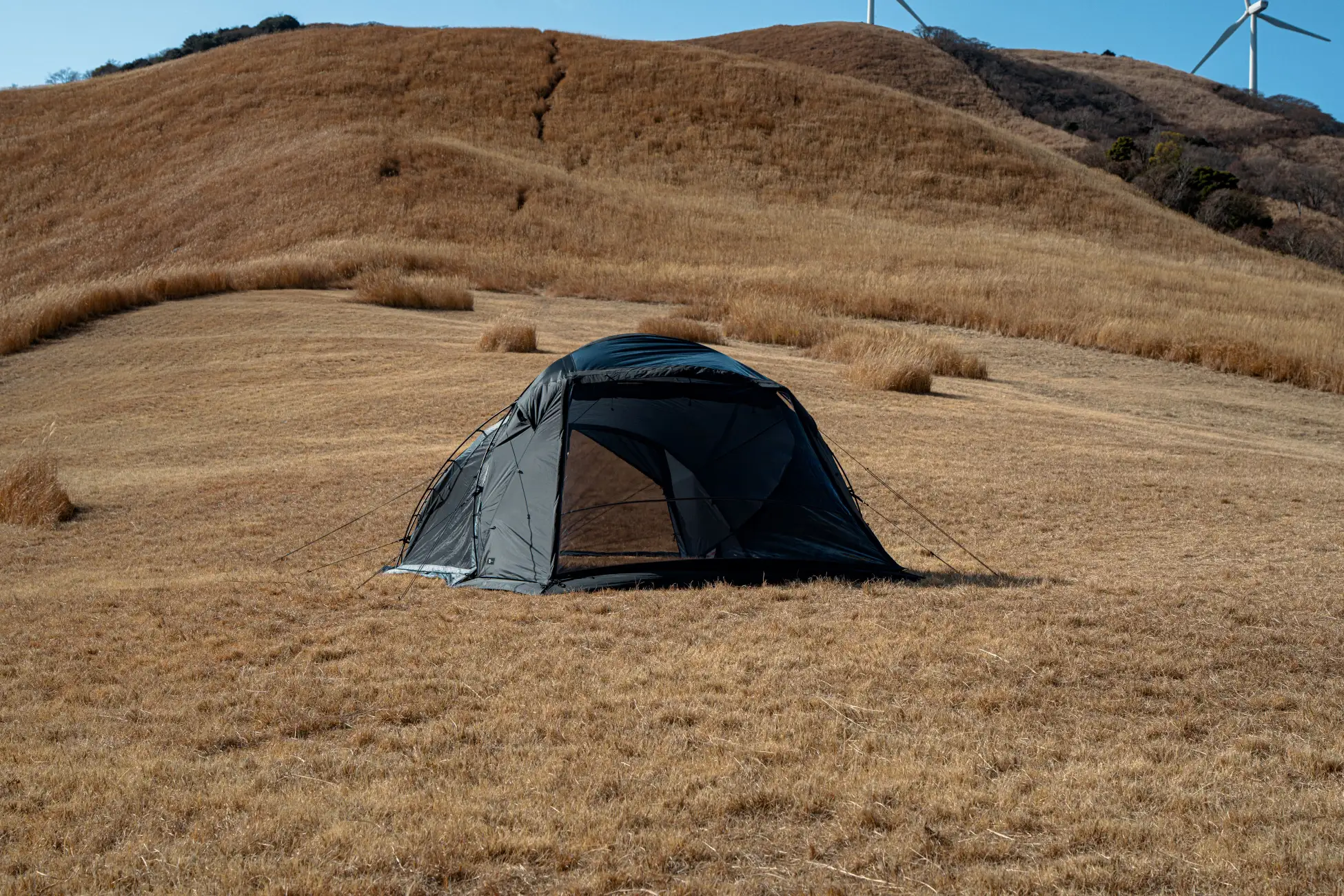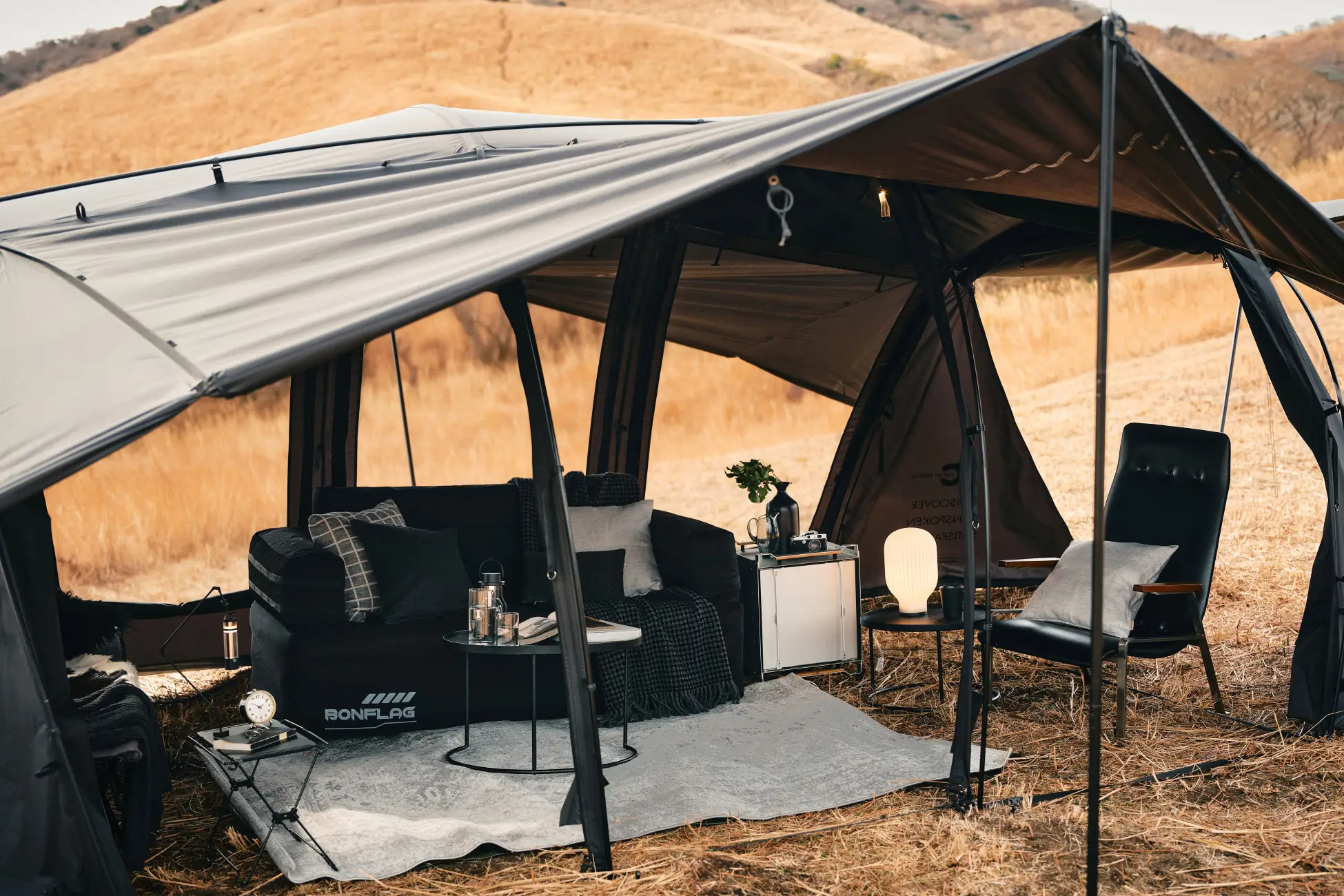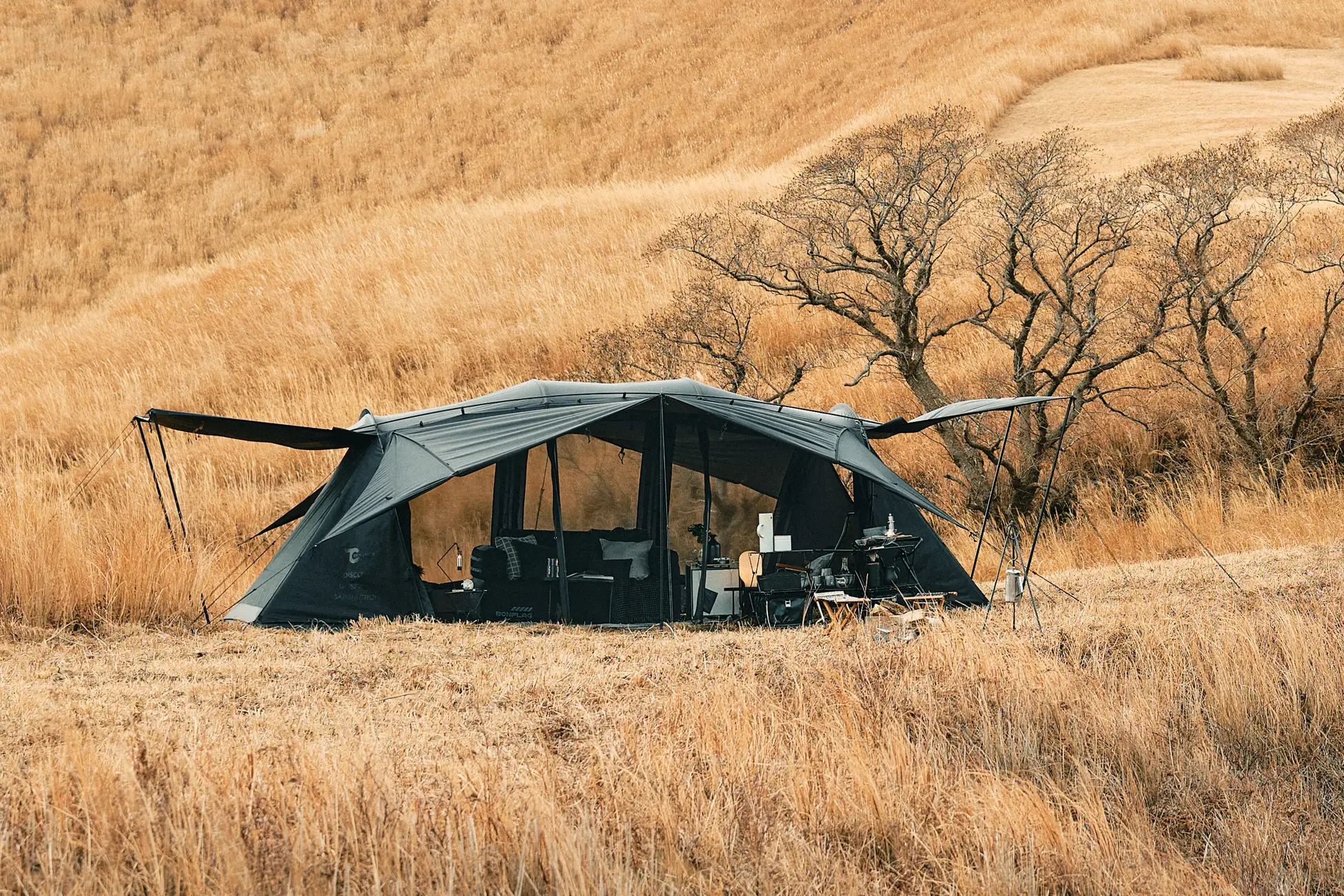 本モデルでは、天井をダブルレイヤー構造へとアップデート。耐水性・断熱性・結露対策といった居住性能を飛躍的に向上させました。さらに、通常モデルのグレーとは一線を画し、生地だけでなくポールや細部のパーツに至るまで、全身をブラックで統一した限定仕様を採用。加えて、5周年の証として、このモデルのためだけの特別なプリントロゴを施しています。