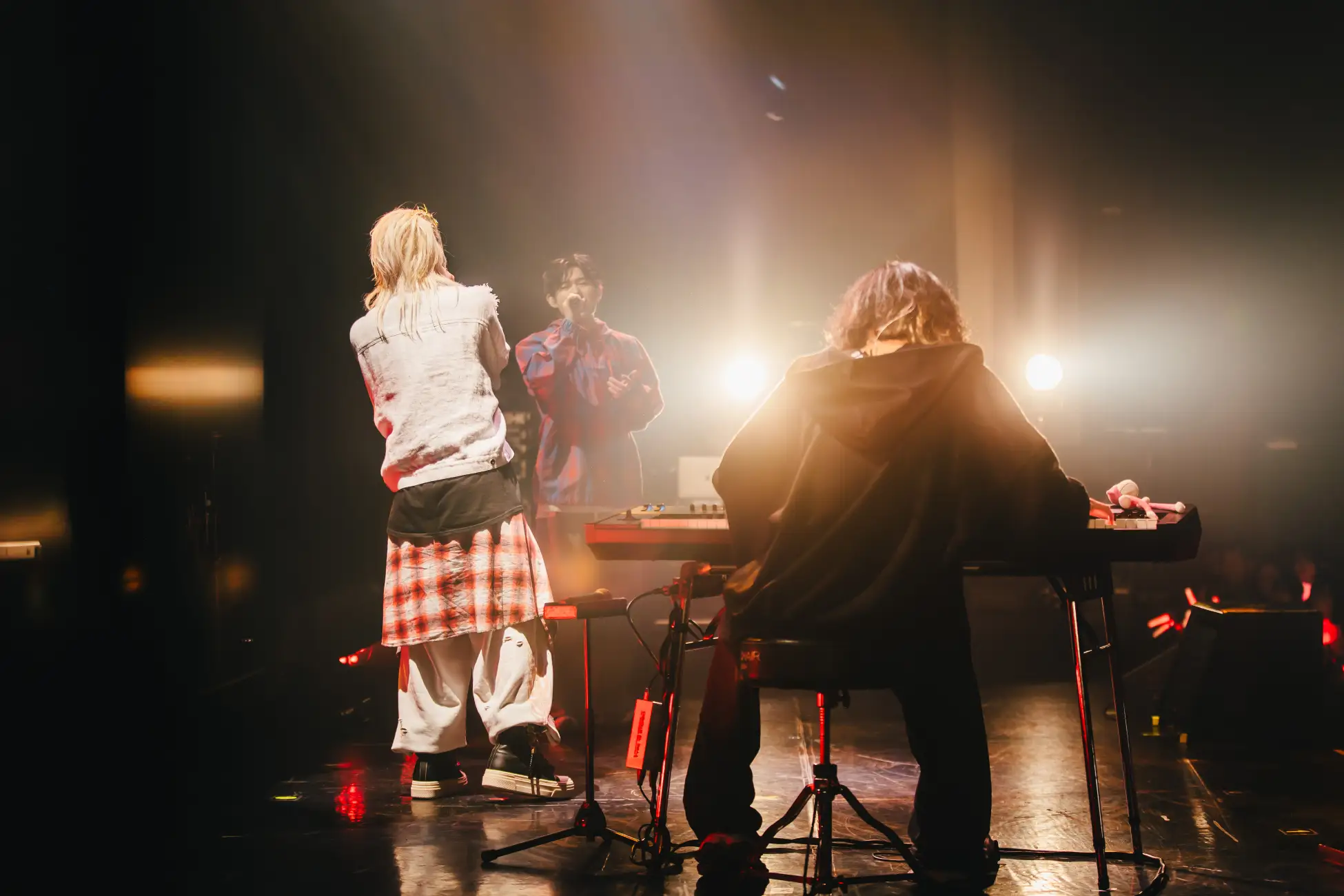 再びのMCでは、りうらの「なんとスペシャルゲストの方が来てくれています。VOISINGメンバーじゃありません」という告白により、場内は騒然とした雰囲気に。一呼吸置いてTani Yuuki氏とまらしぃ氏が呼び込まれると、さらに大きな喝采が豊洲PITを埋め尽くした。今年8月に行われたYouTubeでのコラボレーションをきっかけに、今回の共演が実現。予想の斜め上をいくゲストの登場に、りうっこの興奮も凄まじく、すっかりゲストのふたりも圧倒されている様子だ。会場が温かな空気に包まれるなか、動画でも披露した「W/X/Y」へ流れ込んでいった。降り積もるように重なるピアノと声は穏やかで、胸の奥にグッと迫りくるものがある。繊細な感情の機微を捉えているからこそ、圧倒的な説得力もあるのだろう。あまりにも美しい共演に、オーディエンスはサイリウムを振るのも忘れ、吸い込まれるように聴きいっていた。