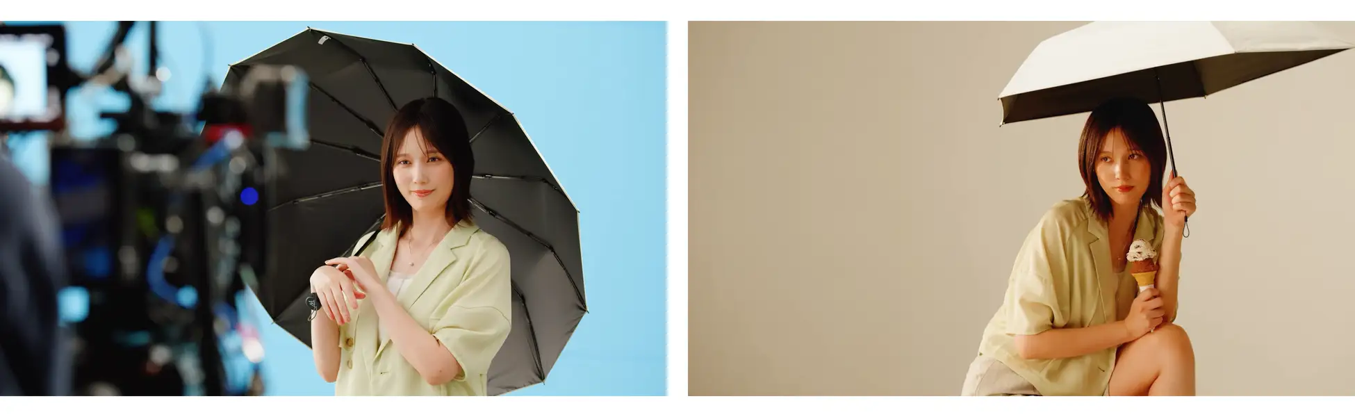 「ミラクルテック プロテクション」では、白いシアー素材の衣装にチェンジ。コンパクトな佇まいと柔らかい衣装が重なり、軽やかさや透明感を感じる仕草が連続して撮影されました。インタビューでは、普段の紫外線対策や、愛犬との散歩で「絶対に傘を持ち歩く」という日常のエピソード、さらには“未来の傘にほしい機能”まで、本田さんらしい視点で語っていただきました。
