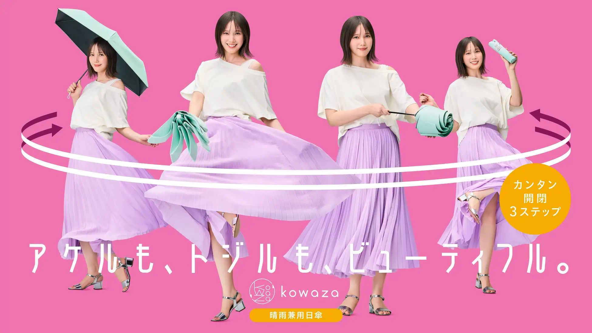 今年の「マジカルテック プロテクション」は、世界最軽量級のシリーズに加え、軽さと強さを両立した「タフシリーズ」 が新登場。Wカーボン骨や12本骨構造により、日常使いしやすい軽さはそのままに、よりしなやかで丈夫なモデルへと進化しました。キービジュアルに掲げたメッセージの「PEACE IN SUMMER」には、酷暑や紫外線、突然の雨といった夏の不快要素を軽減し、傘を通して快適で涼やかな時間を提供したいというメッセージを込めています。また、ミラクルテックは世界最小級の小ささの携帯性はそのままに遮光機能を持たせた「ミラクルテック プロテクション」が仲間入り。kowaza は、更にたたみやすくなった軽量でスリムな新シリーズを加えアップデート。日差し・雨・風など多様な天候に対応できるラインナップとして展開いたします。
