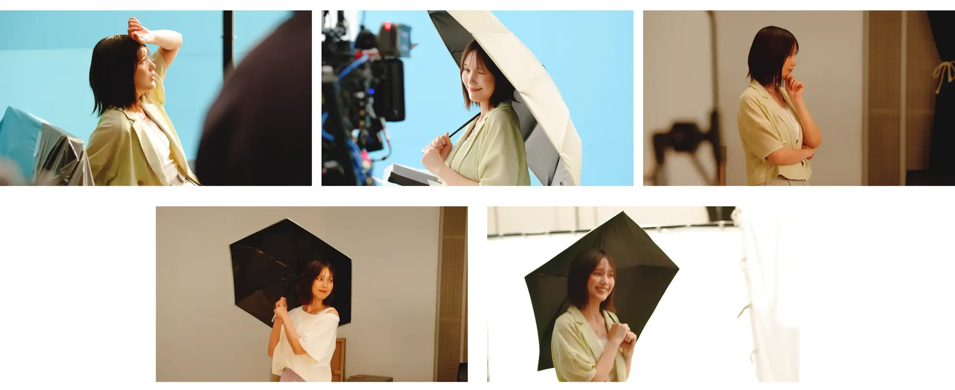 撮影は都内近郊のスタジオで行われました。本田さんはミントグリーンのジャケットにショートパンツという爽やかな衣装で登場。最初にマジカルテック プロテクションを手にした瞬間、「軽っ!」と思わず声がこぼれ、自然体の笑顔を見せていました。カメラが回ると、日傘を開いたり持ち歩いたりする動きを丁寧にこなし、今回のシリーズが持つ、軽さと扱いやすさをのびやかに表現しました。続く「kowaza」では、オフショルダーのTシャツと動きの出るロングスカートに衣装を替え、軽快な開閉動作をテンポよく撮影。本田さん自身のアイデアで“スカートの揺れと日傘の動きを合わせる”カットも追加され、軽やかな動作と衣装のラインがリンクする印象的なシーンとなりました。