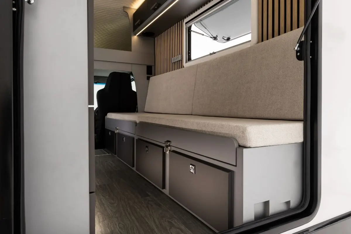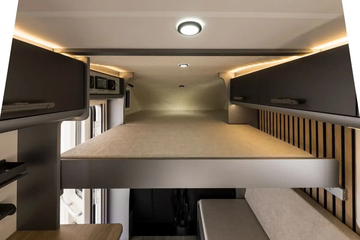 引き出しタイプのバンクベッドを搭載。コンパクトなサイズの車内でも、しっかりと就寝スペースを確保。