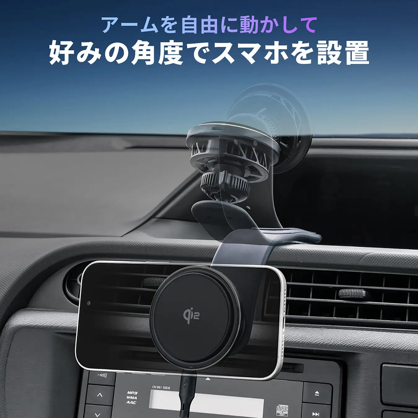 MagSafe対応車載ホルダー スマホホルダー ワイヤレス充電 Qi2充電 15W 冷却機能付き 自由調整 超強力吸着 カー用品 3M 粘着テープ メタルリング付属